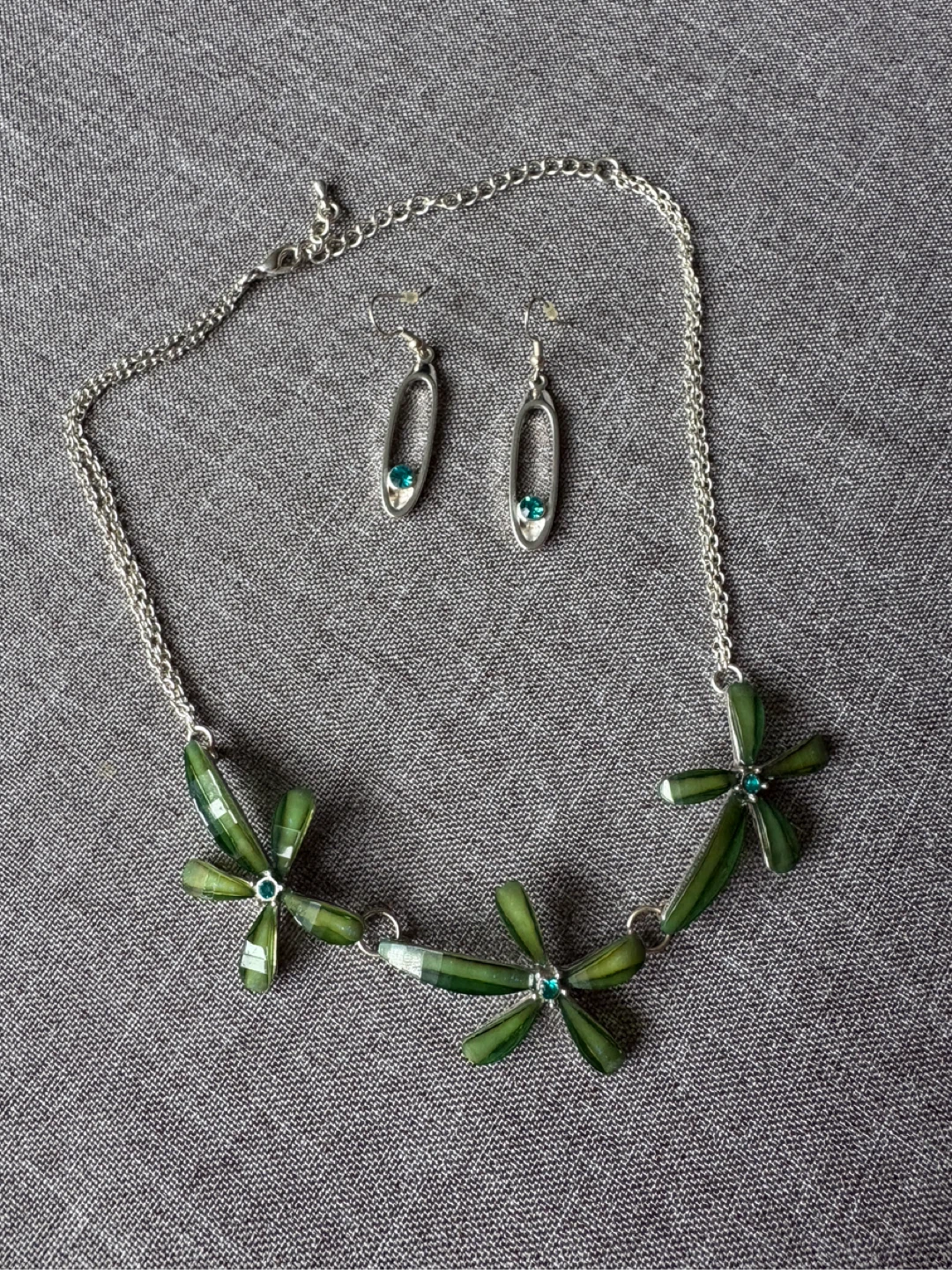 Here's a lovely necklace and earring set featuring a green floral design. The set includes a necklace and matching earrings, perfect for adding a touch of nature-inspired style to your look