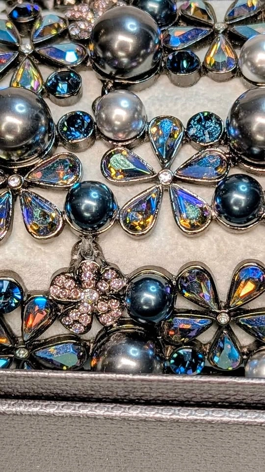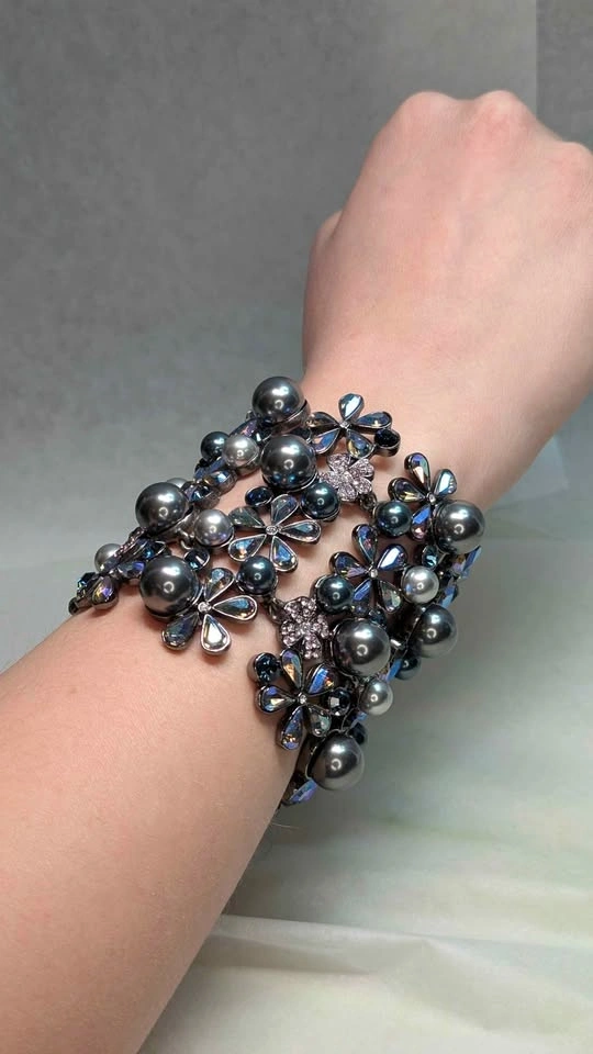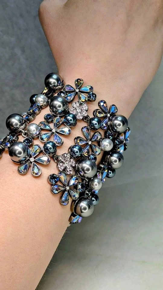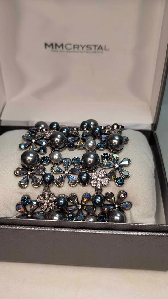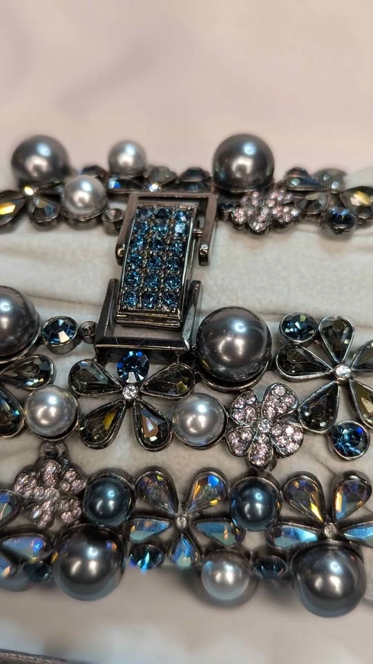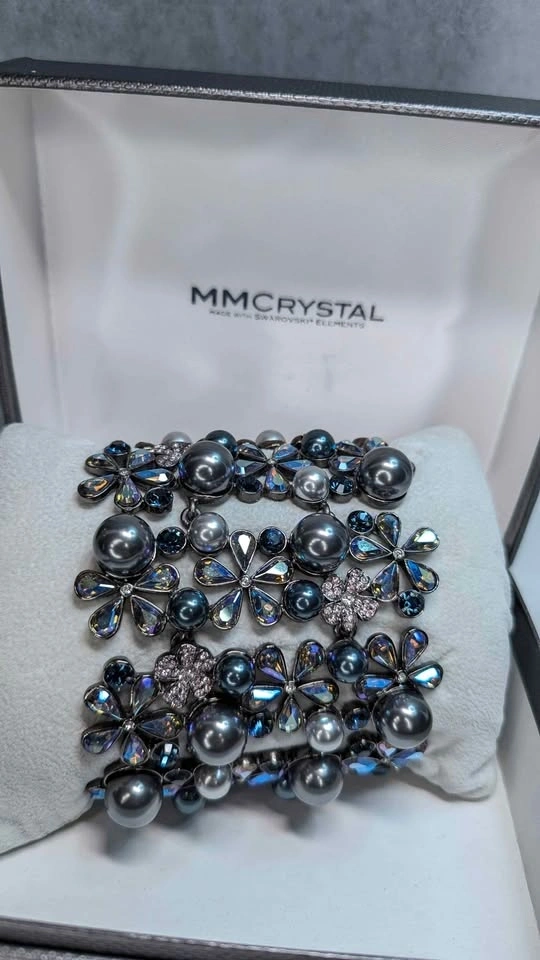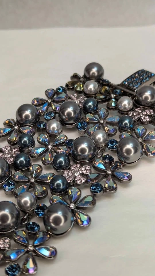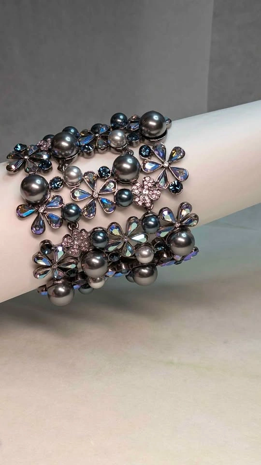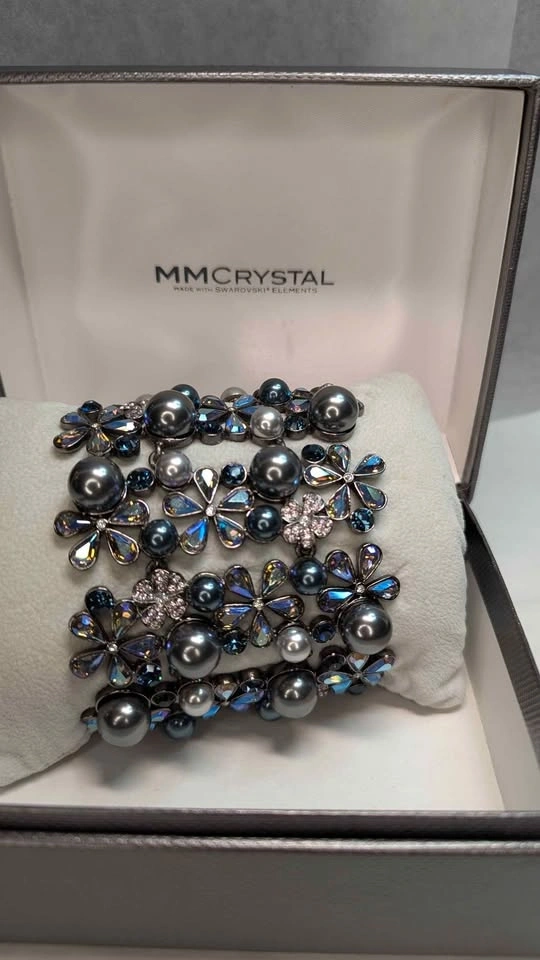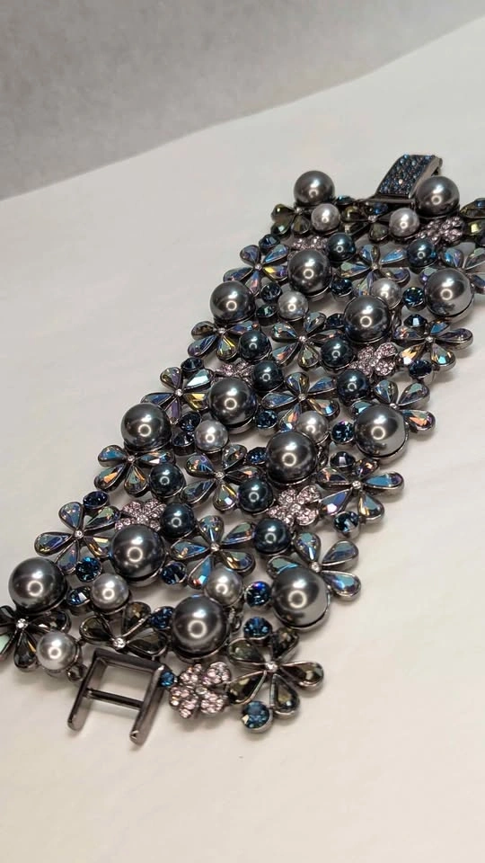 Elevate your formal wear with this delicate floral bracelet featuring iridescent blue-gray pearls and sparkling Swarovski crystal petals. The blue-gray color adds a sophisticated shimmer. Lightweight and comfortable for special occasions. A stylish, feminine accessory. Jeweled clasp. New in box never worn.