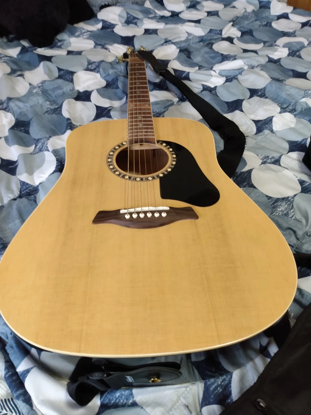 This is an Ashbury AG-08 acoustic guitar. It features a light wood top and a black gloss finish on the back and sides. Includes a black gig bag for protection. Great for learning or casual playing!