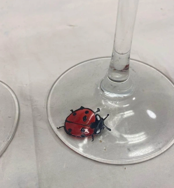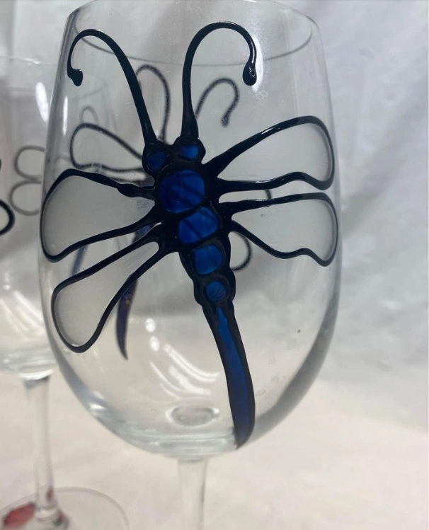 Like new condition from pet free smoke free home. This pair of wine glasses have only been used for decorative purposes. Each glass has 2 hand painted dragonflies on each side and a ladybug on the base. They stand 9.25” high. NSPU. If the ad is up, they are available.