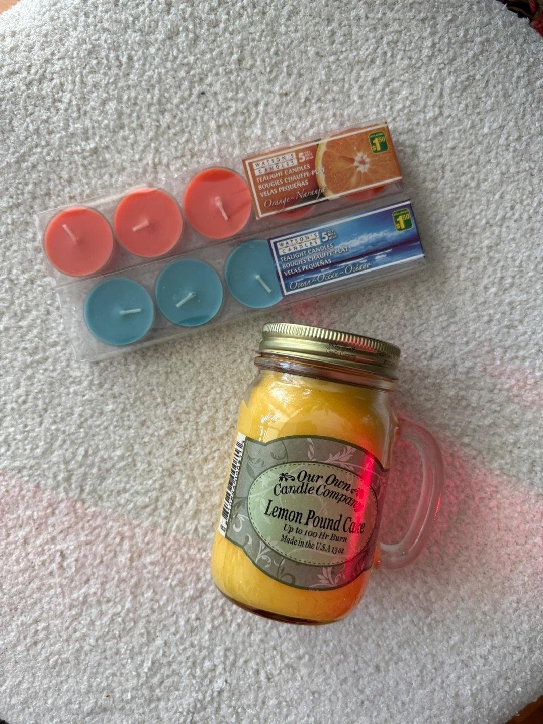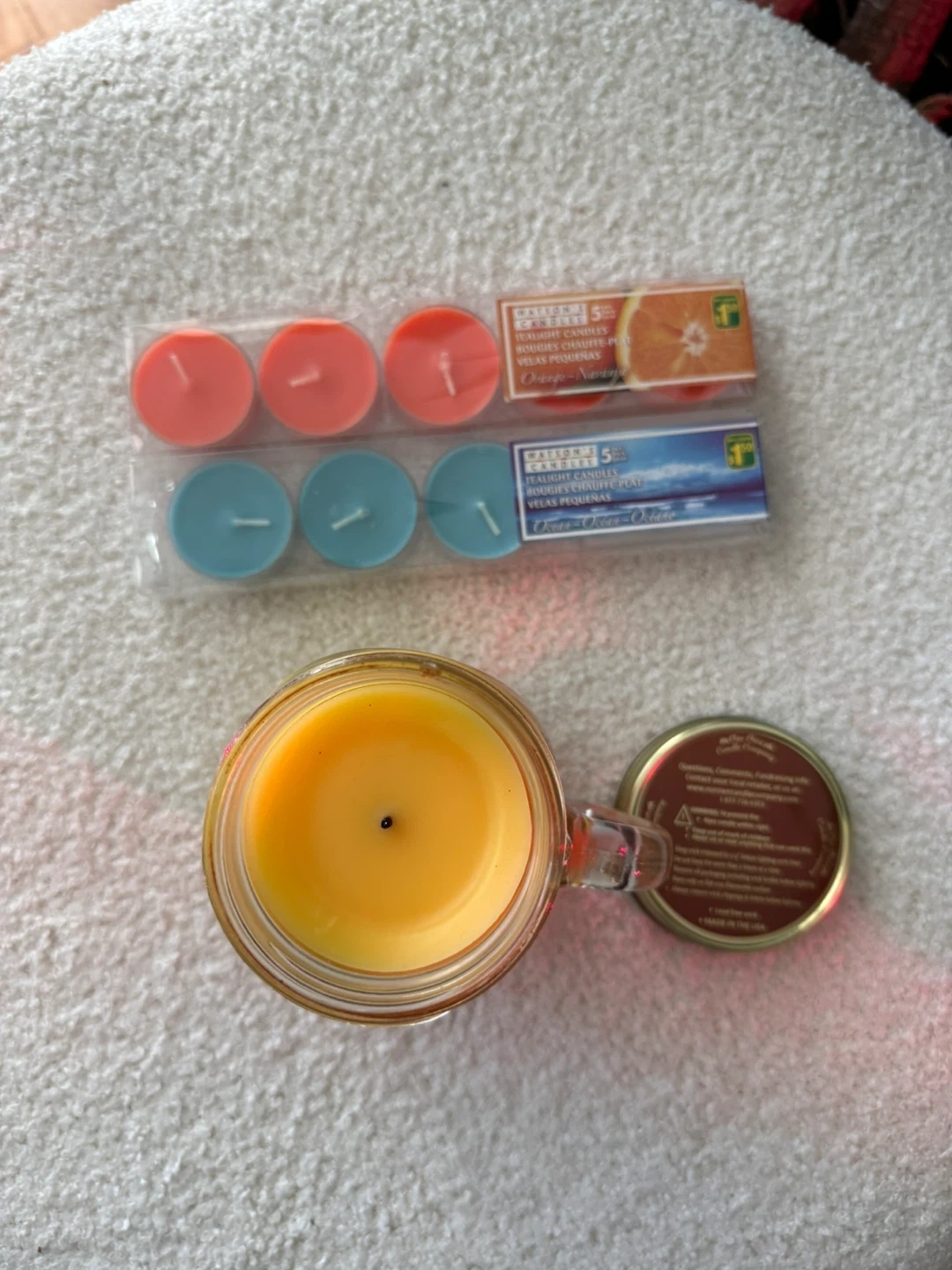 5 tealight candles in Orange Vanilla and 3 Ocean Breeze scents.