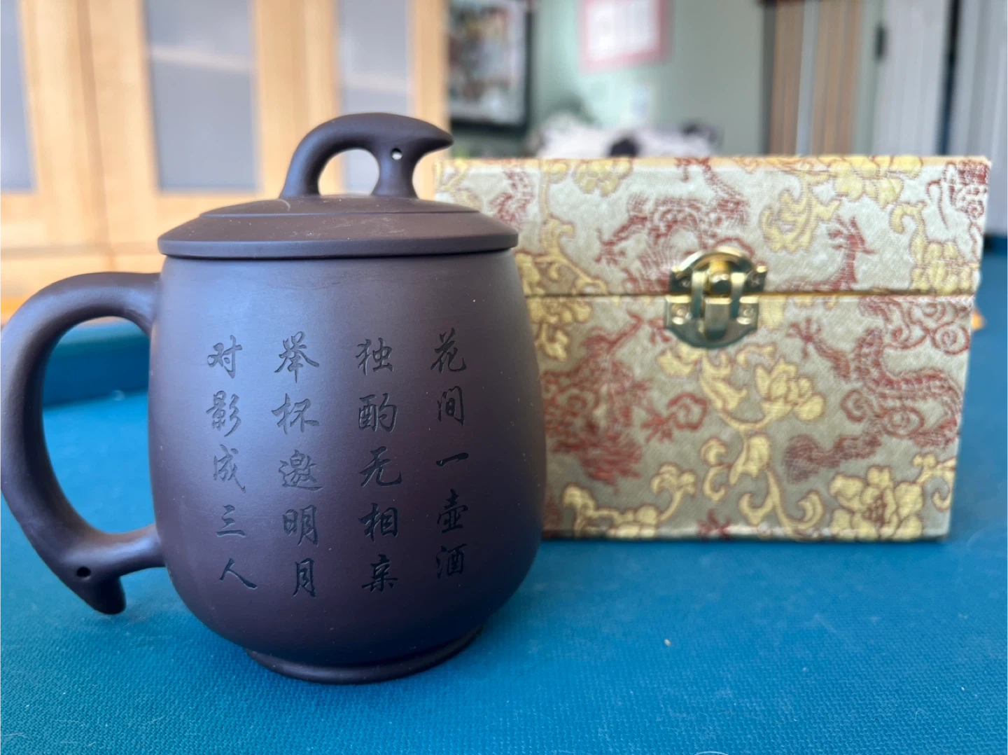 The mug has Chinese characters etched onto both sides. perfect for enjoying your favourite tea!