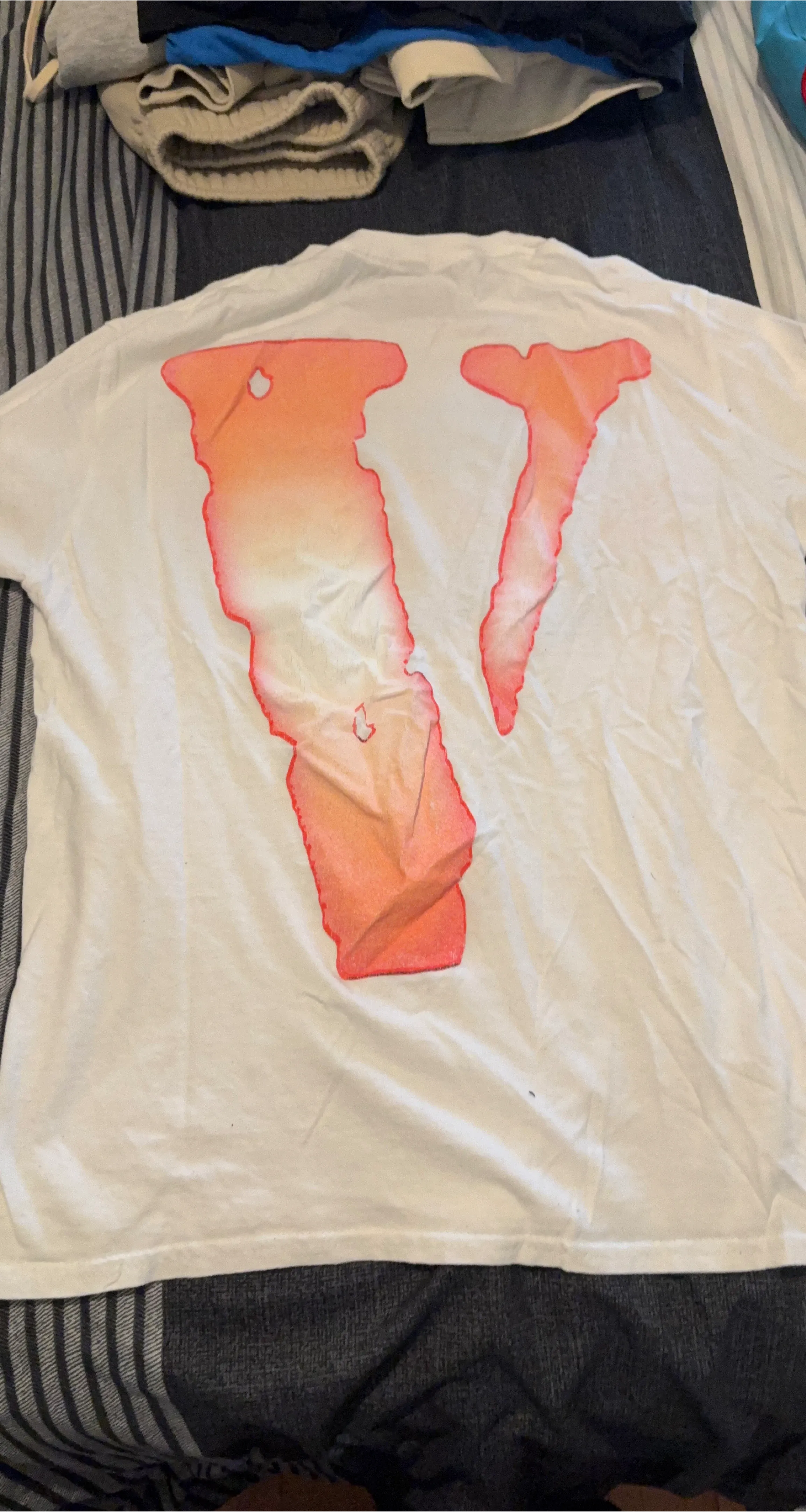 Selling a Vlone T-shirt with the signature "V" logo on the back. It's a white tee with a large orange-red graphic. Perfect for fans of streetwear or Vlone's unique style