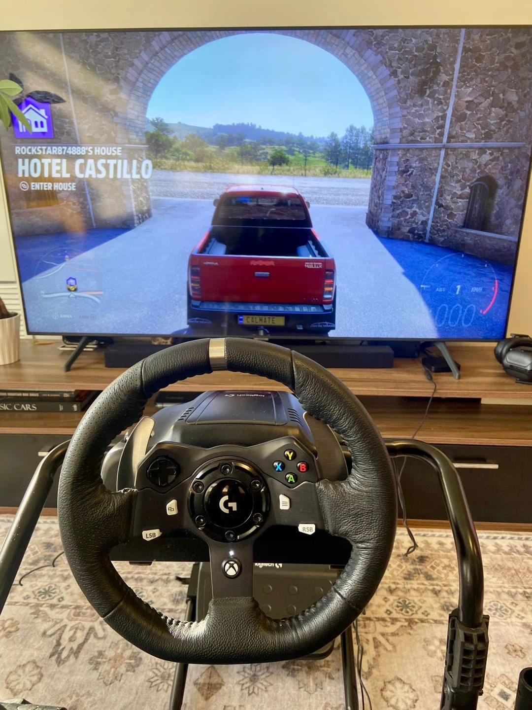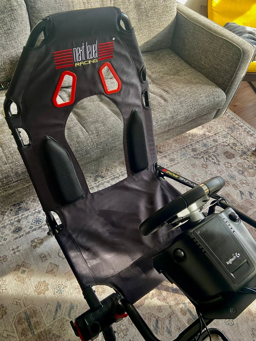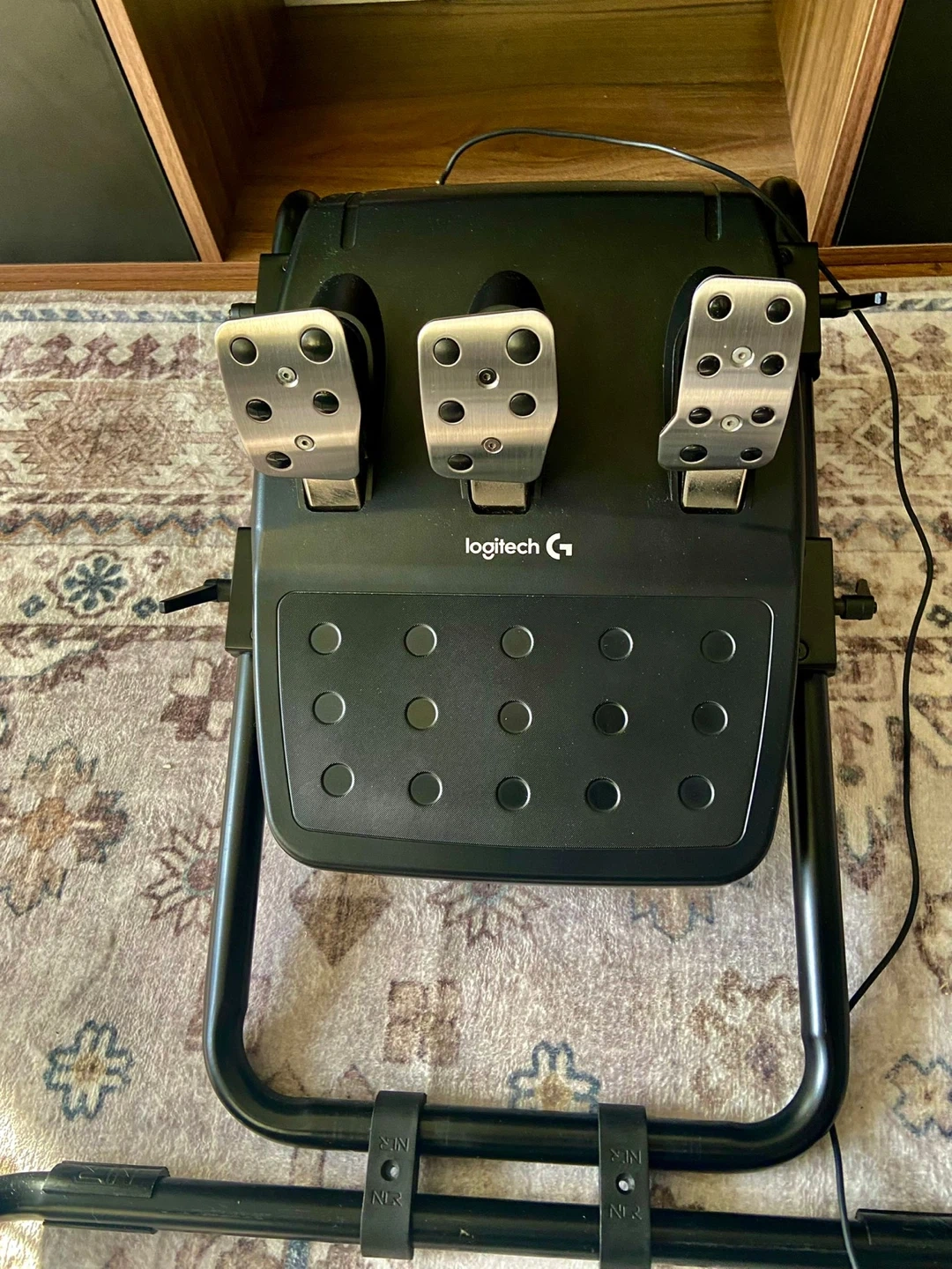 This is a Next Level Racing wheel stand, perfect for setting up your racing simulator. It's designed to hold a Logitech G920 steering wheel and pedals.