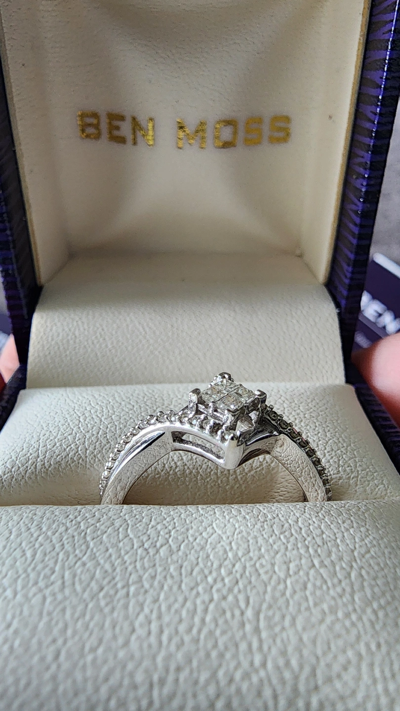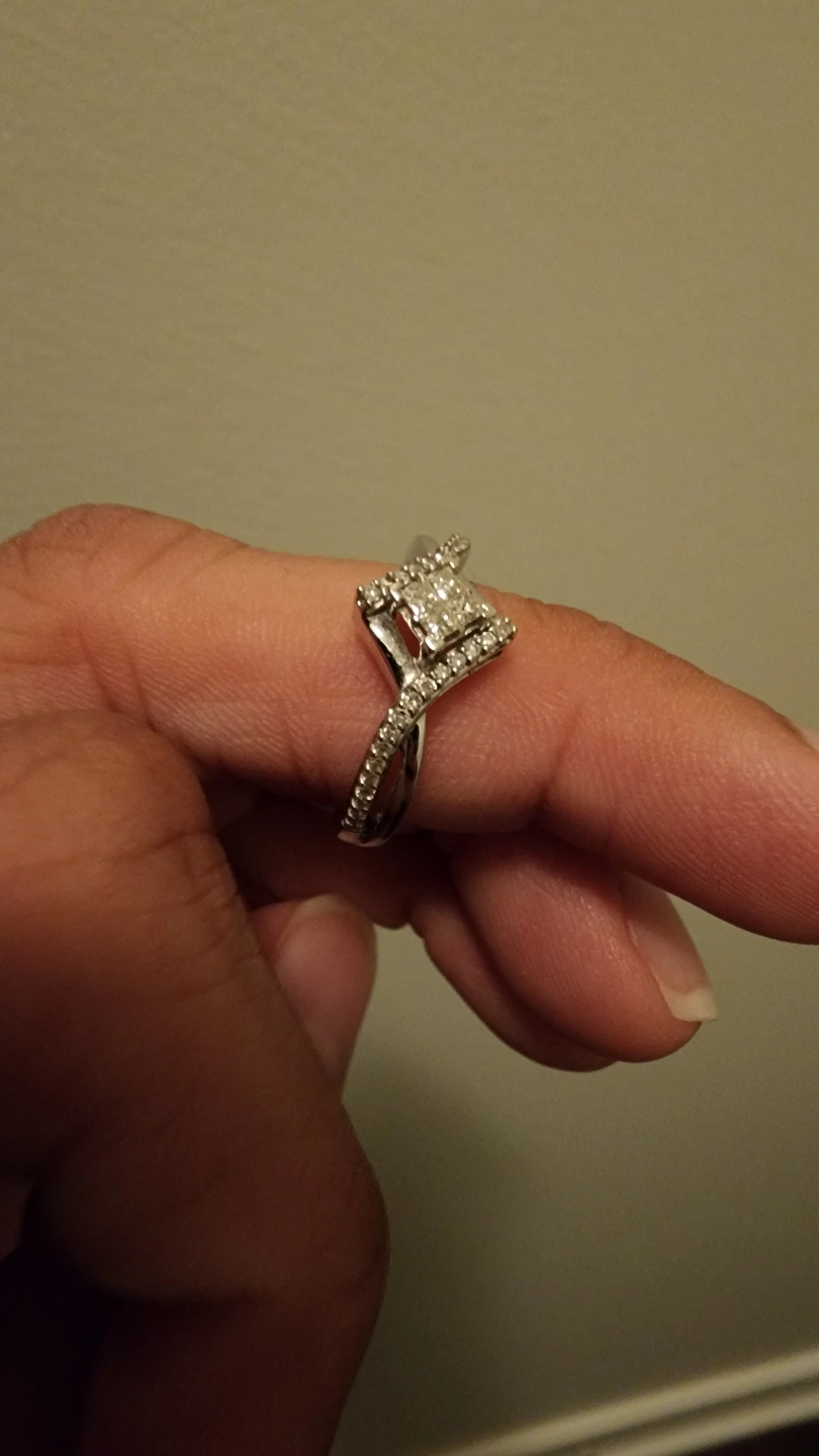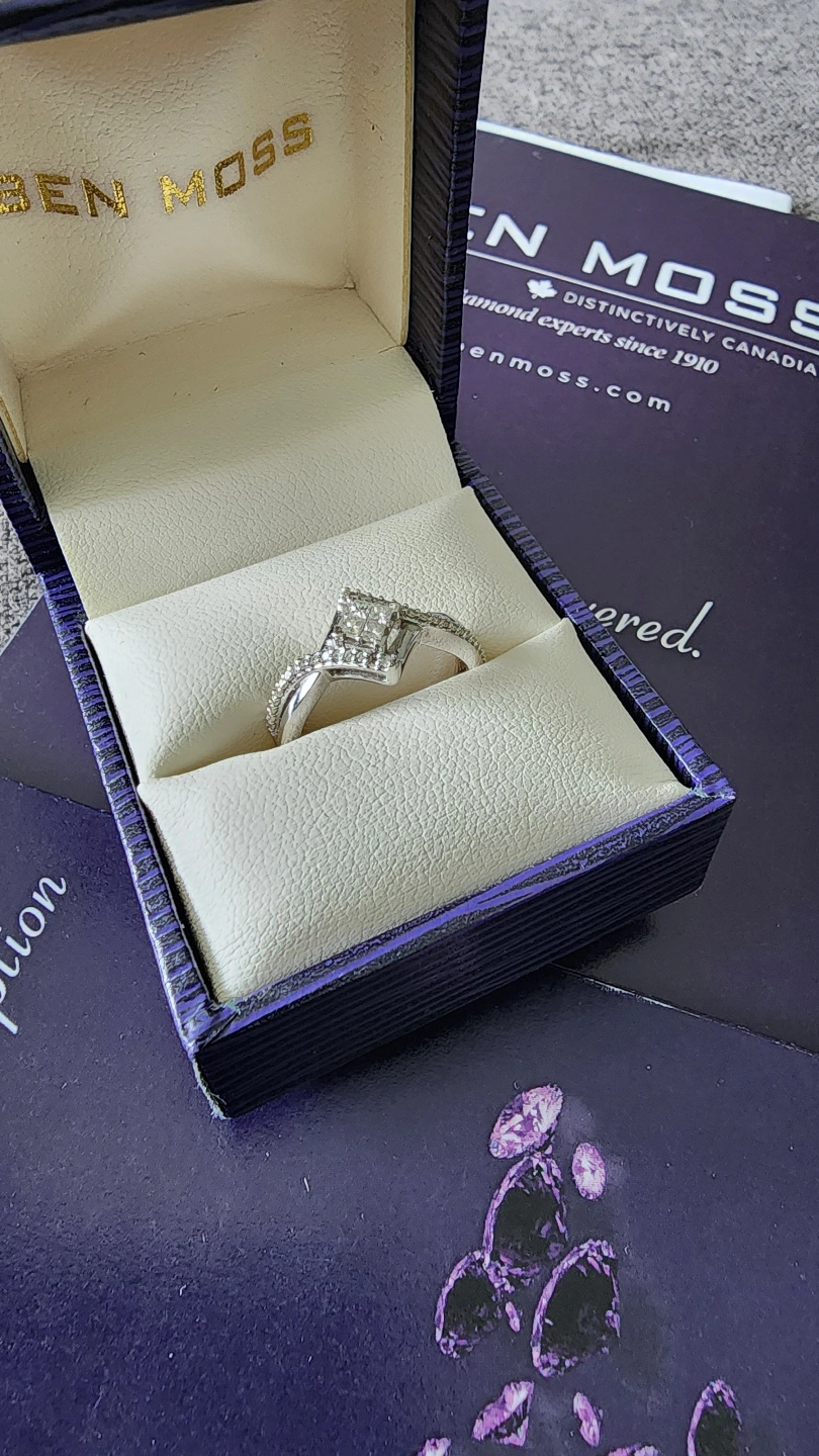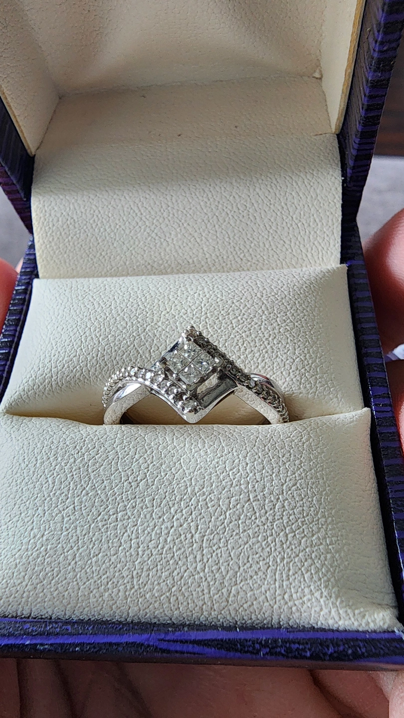 Beautiful 10K White Gold 0.25 CTW diamond promise ring. Princess-cut centre stone. Smaller diamonds on the band. Twist design.