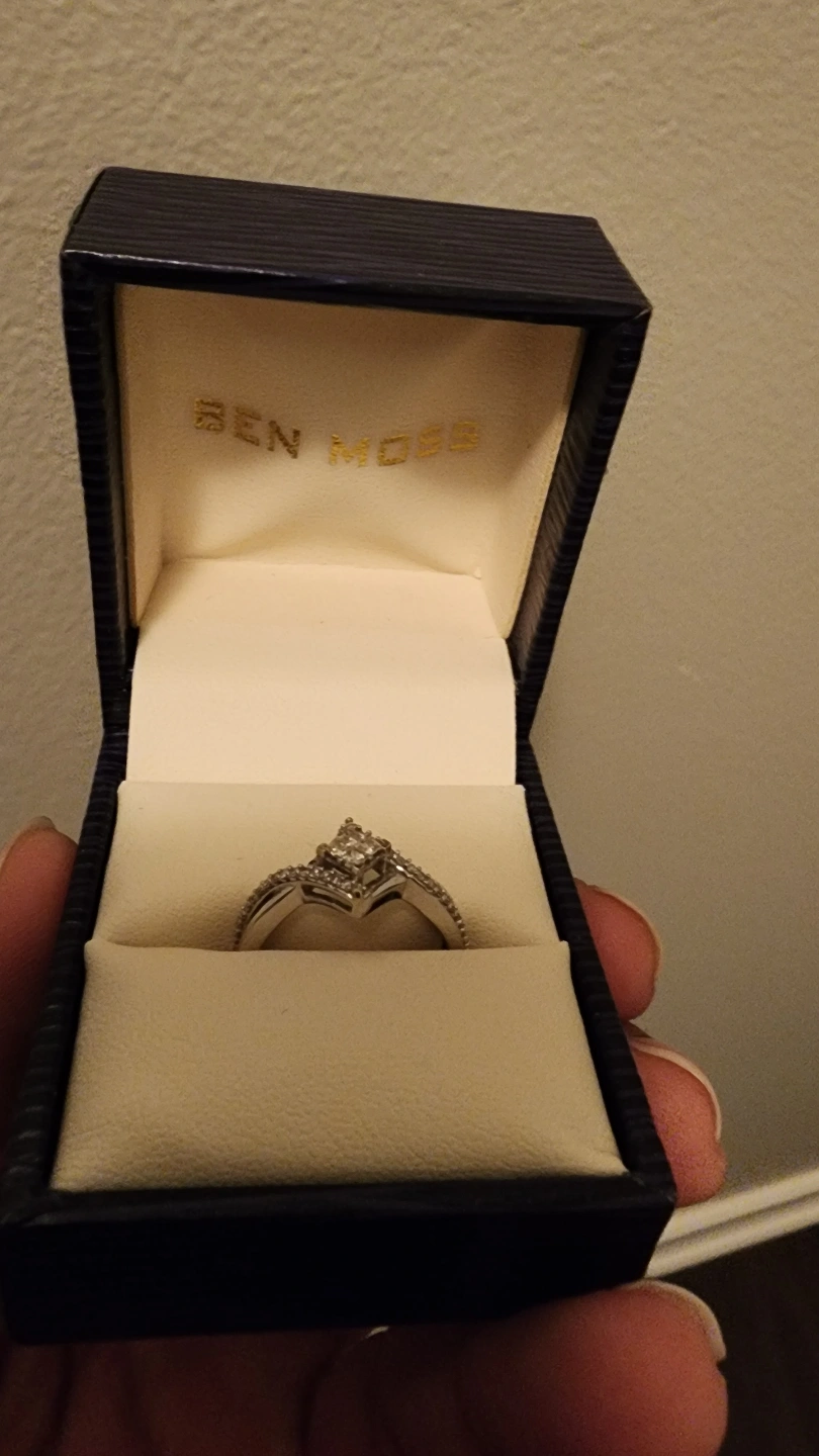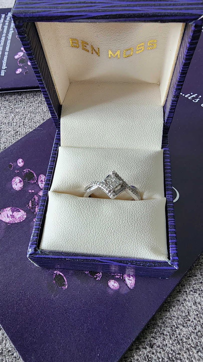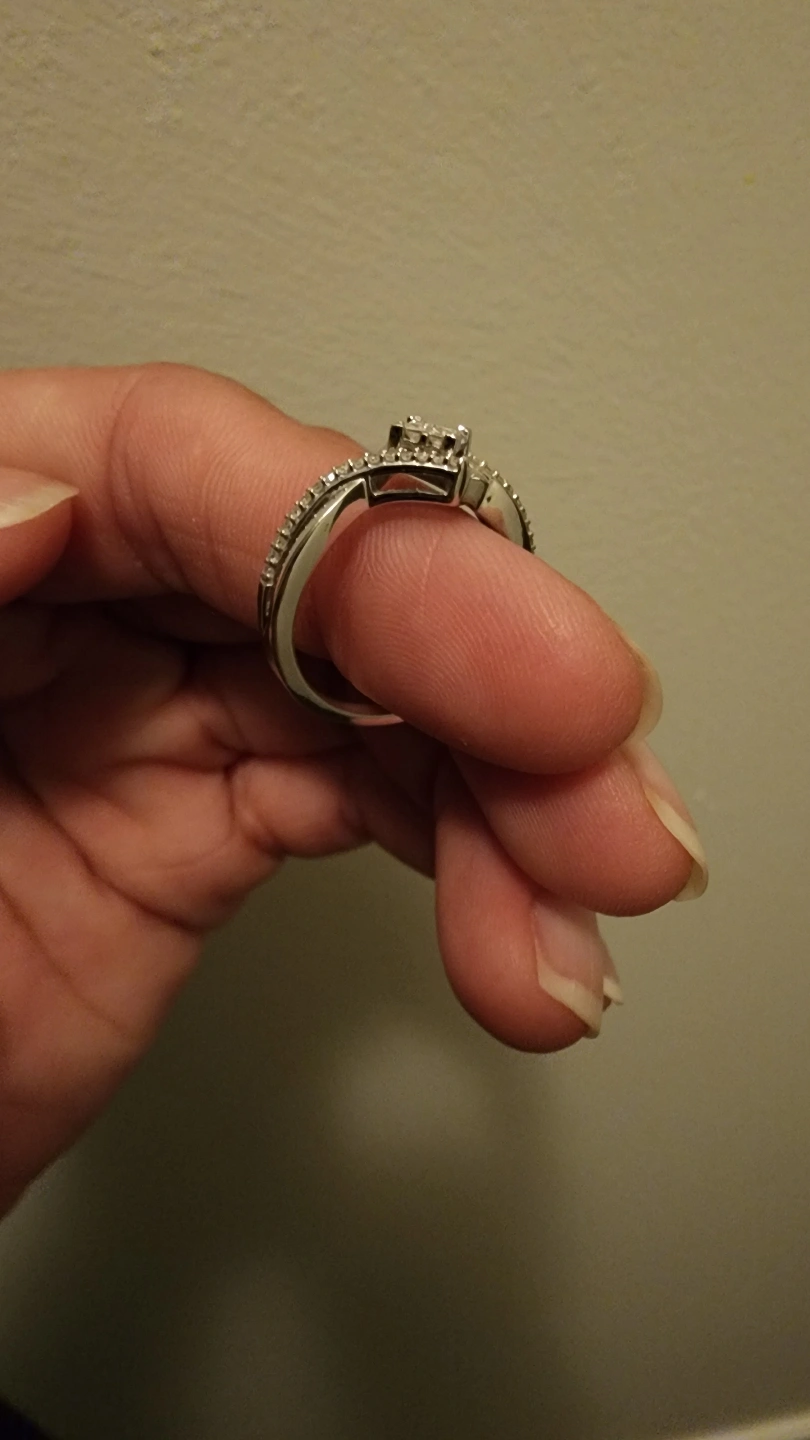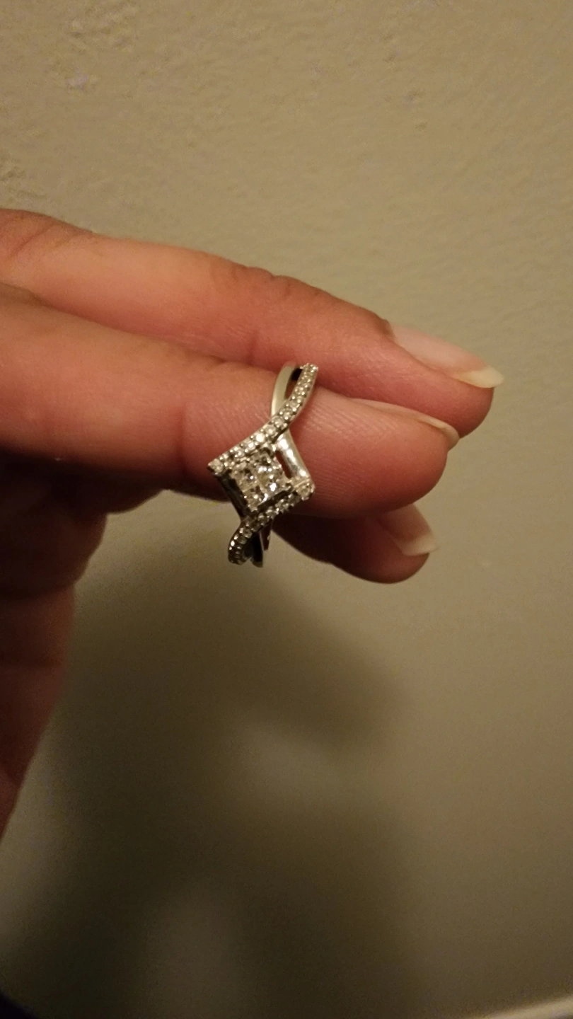 Beautiful 10K White Gold 0.25 CTW diamond promise ring. Princess-cut centre stone. Smaller diamonds on the band. Twist design.