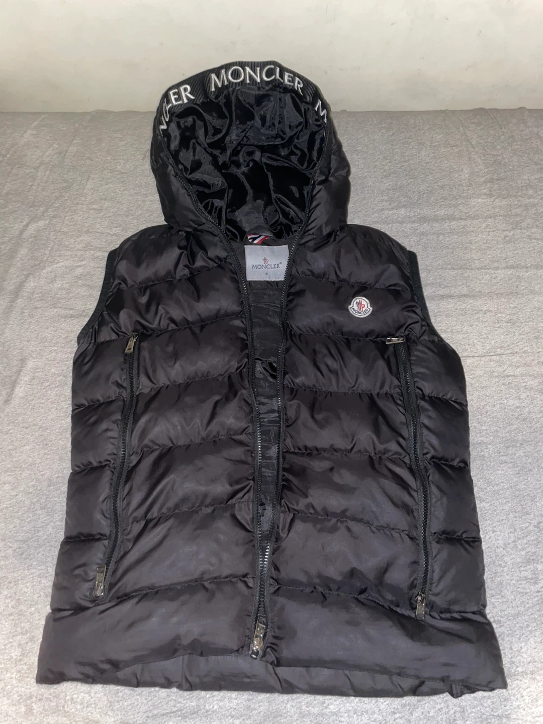 This is a black puffer vest from Moncler. It features a full-zip front and zippered pockets. The inside of the hood has Moncler branded trim.
