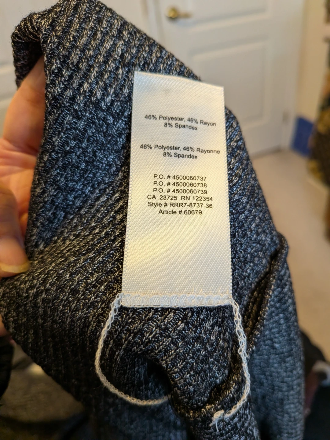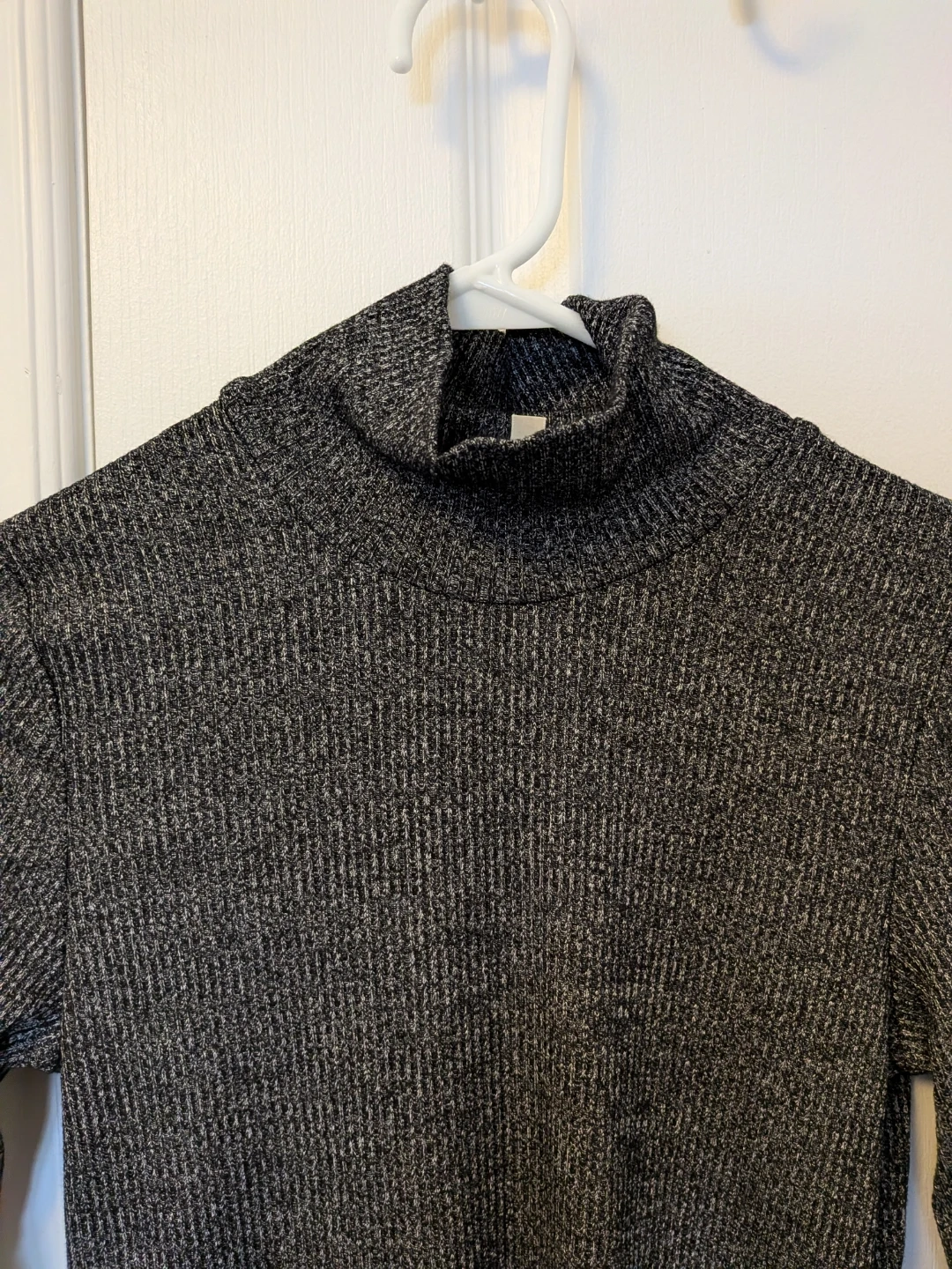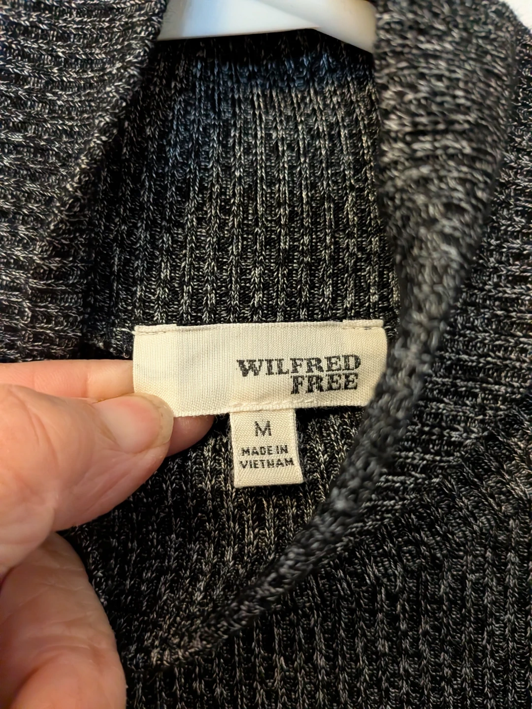 Selling a Wilfred Free knit dress in size medium. It's a stylish grey colour and made of 46% polyester, 46% rayon, and 8% spandex. The style number is RRR7-8737-36 and article number is 60679.