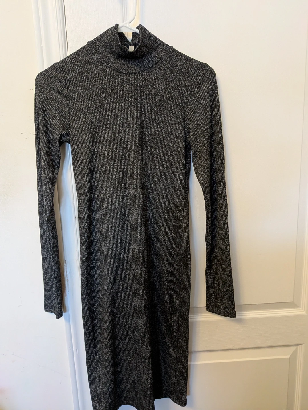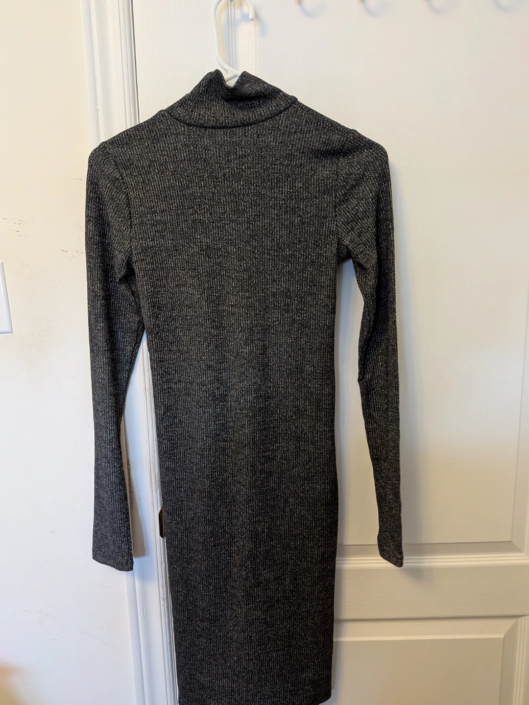 Selling a Wilfred Free knit dress in size medium. It's a stylish grey colour and made of 46% polyester, 46% rayon, and 8% spandex. The style number is RRR7-8737-36 and article number is 60679.