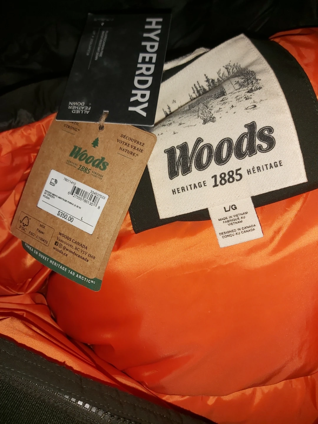 This Woods Heritage 1885 jacket is a men's size L. It's a puffer style with a hood and features HyperDRY technology. The outer colour is olive green with a bright orange lining. It's designed in Canada and made in Vietnam.