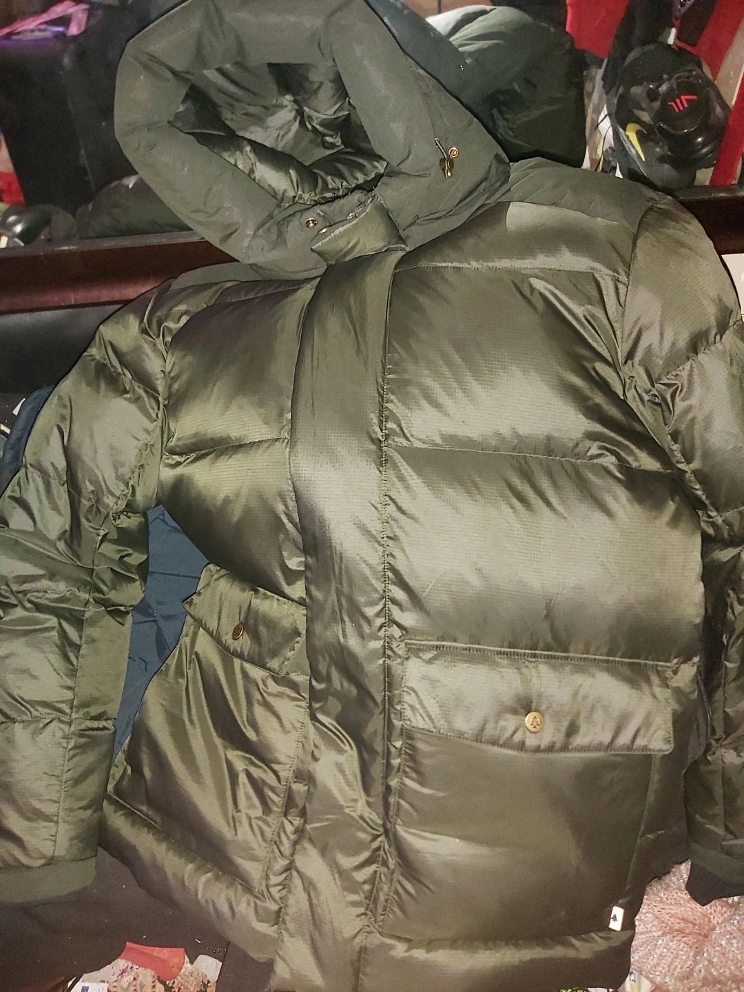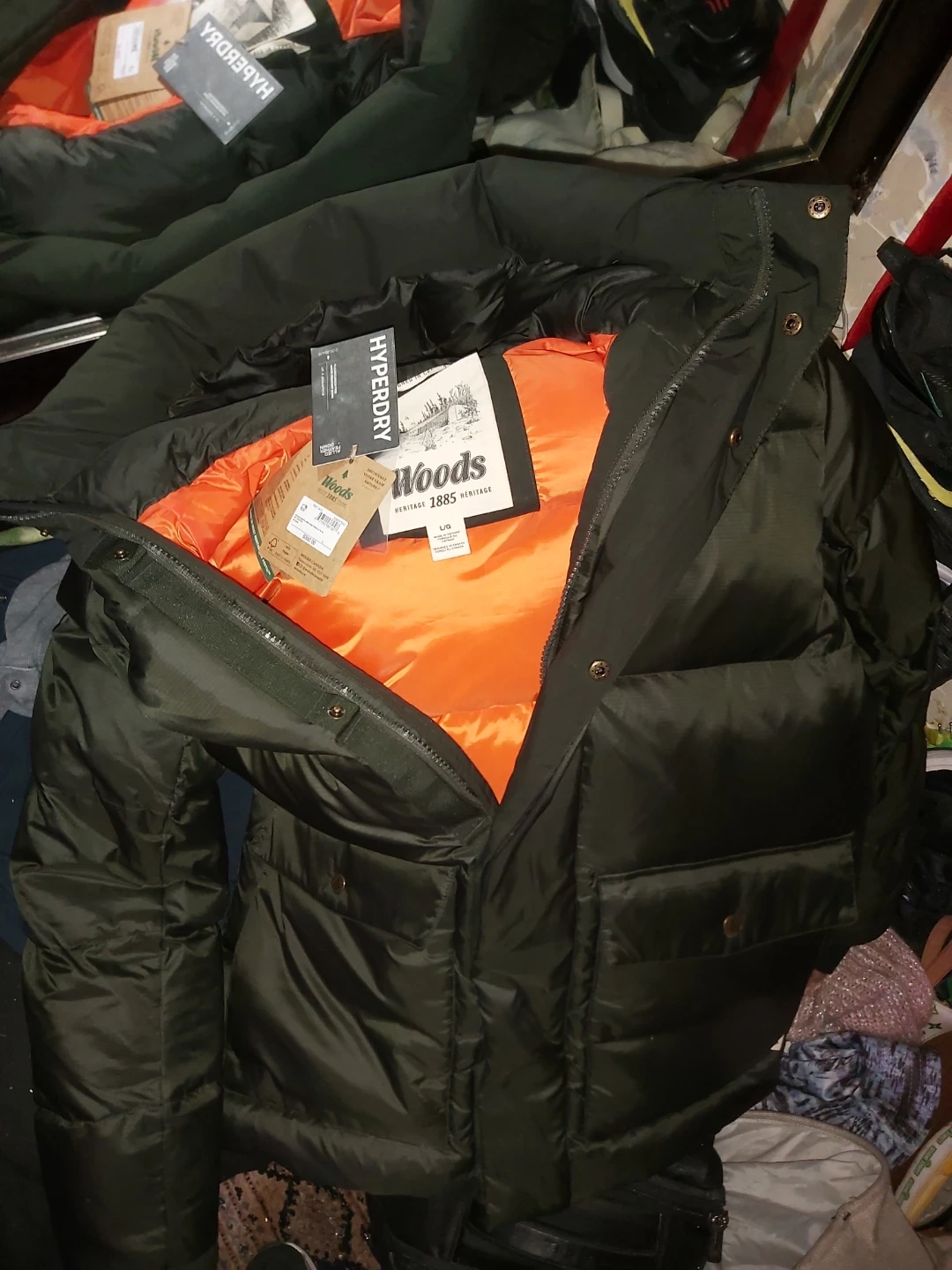 This Woods Heritage 1885 jacket is a men's size L. It's a puffer style with a hood and features HyperDRY technology. The outer colour is olive green with a bright orange lining. It's designed in Canada and made in Vietnam.