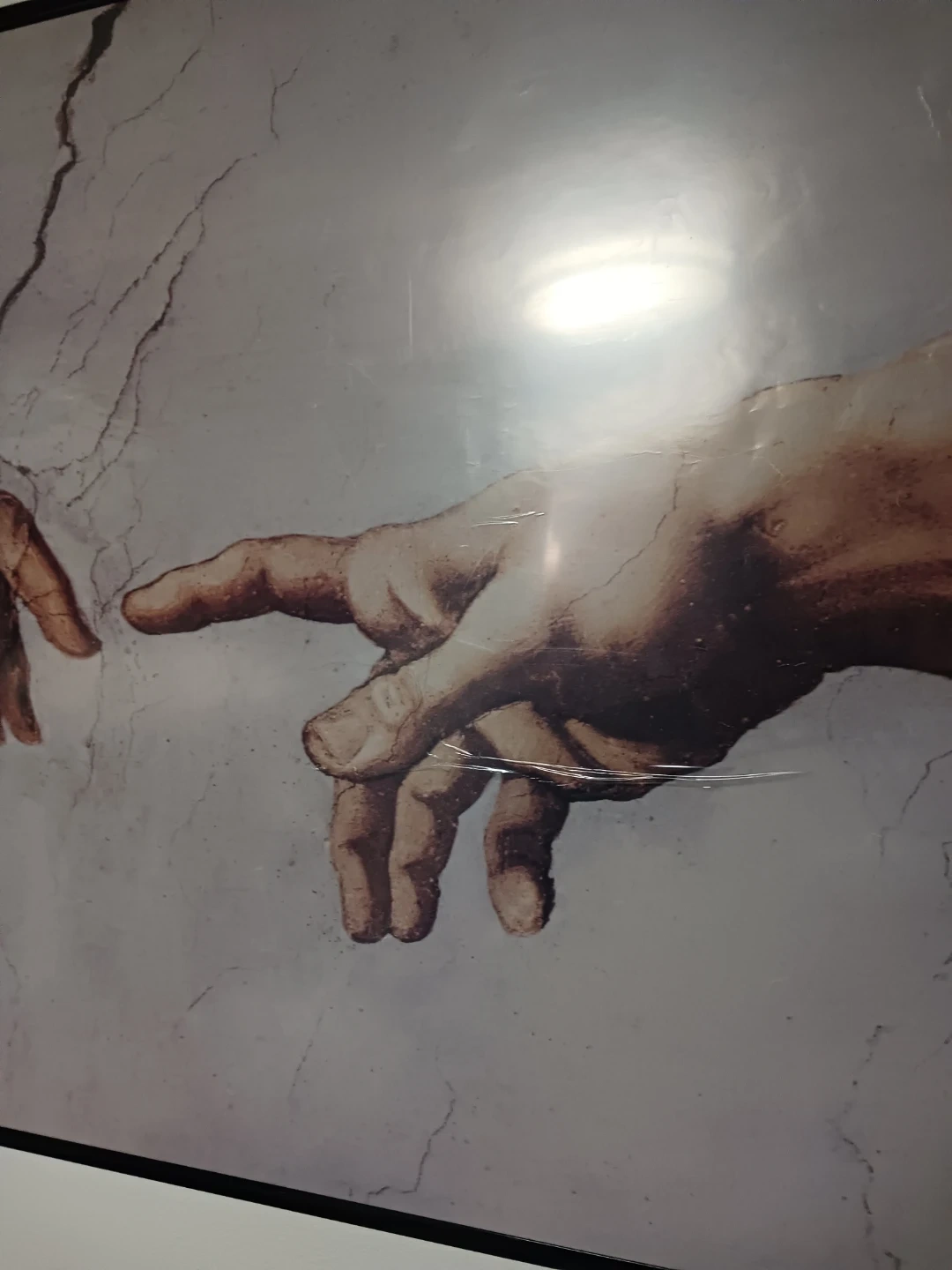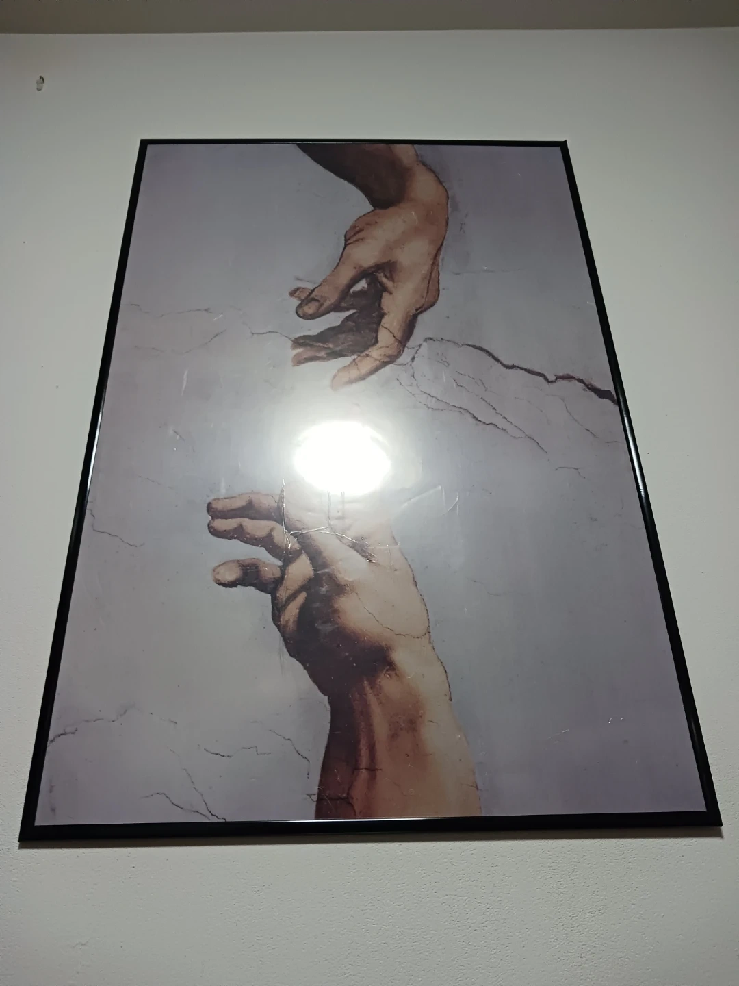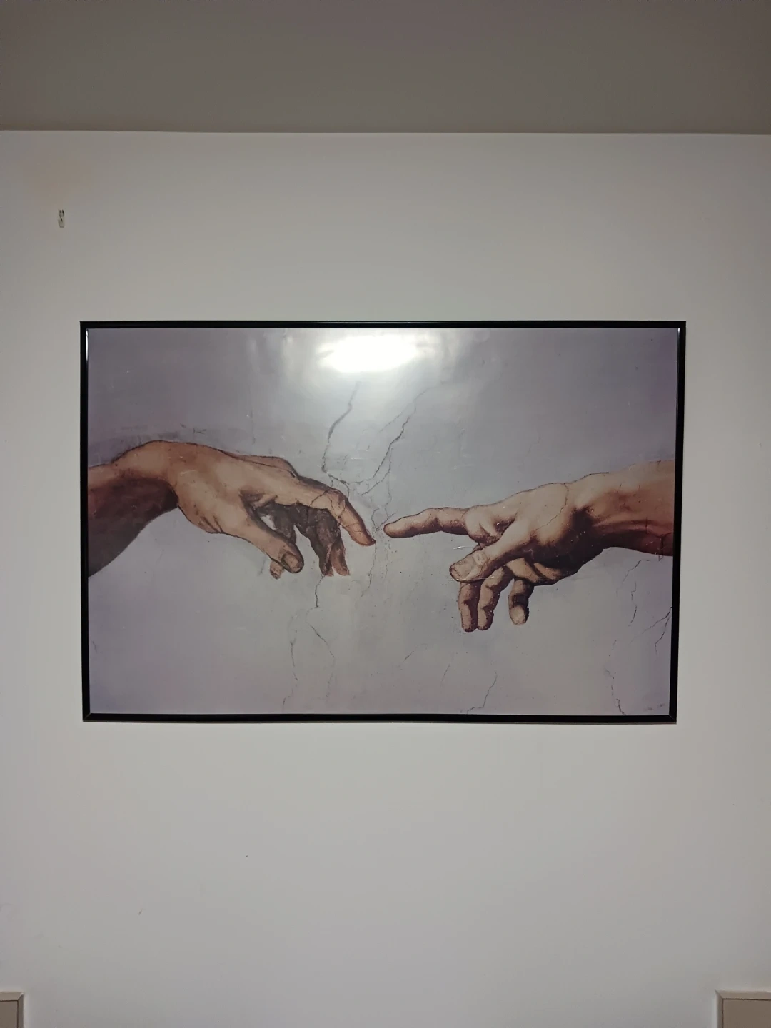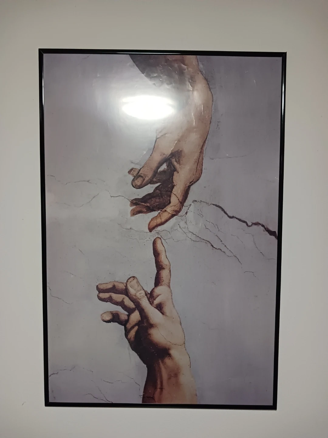 Large framed wall art featuring the iconic hands reaching toward each other design. This piece adds a timeless, elegant touch to any space and works great in living rooms, bedrooms, offices, or studios. Clean neutral tones make it easy to match with modern, minimalist, or classic decor styles.