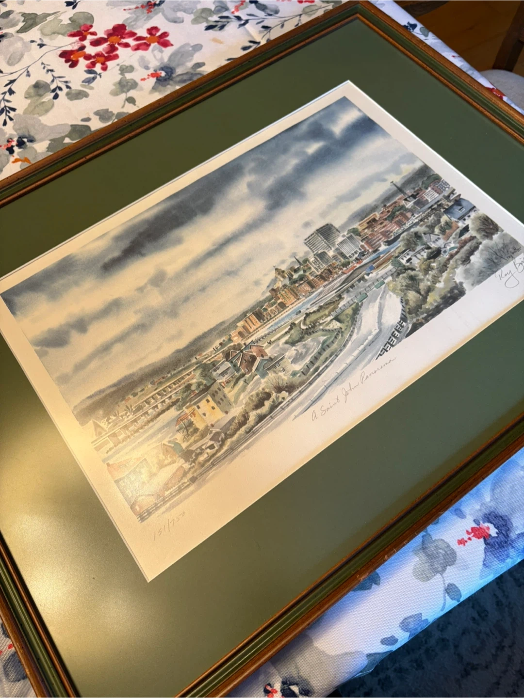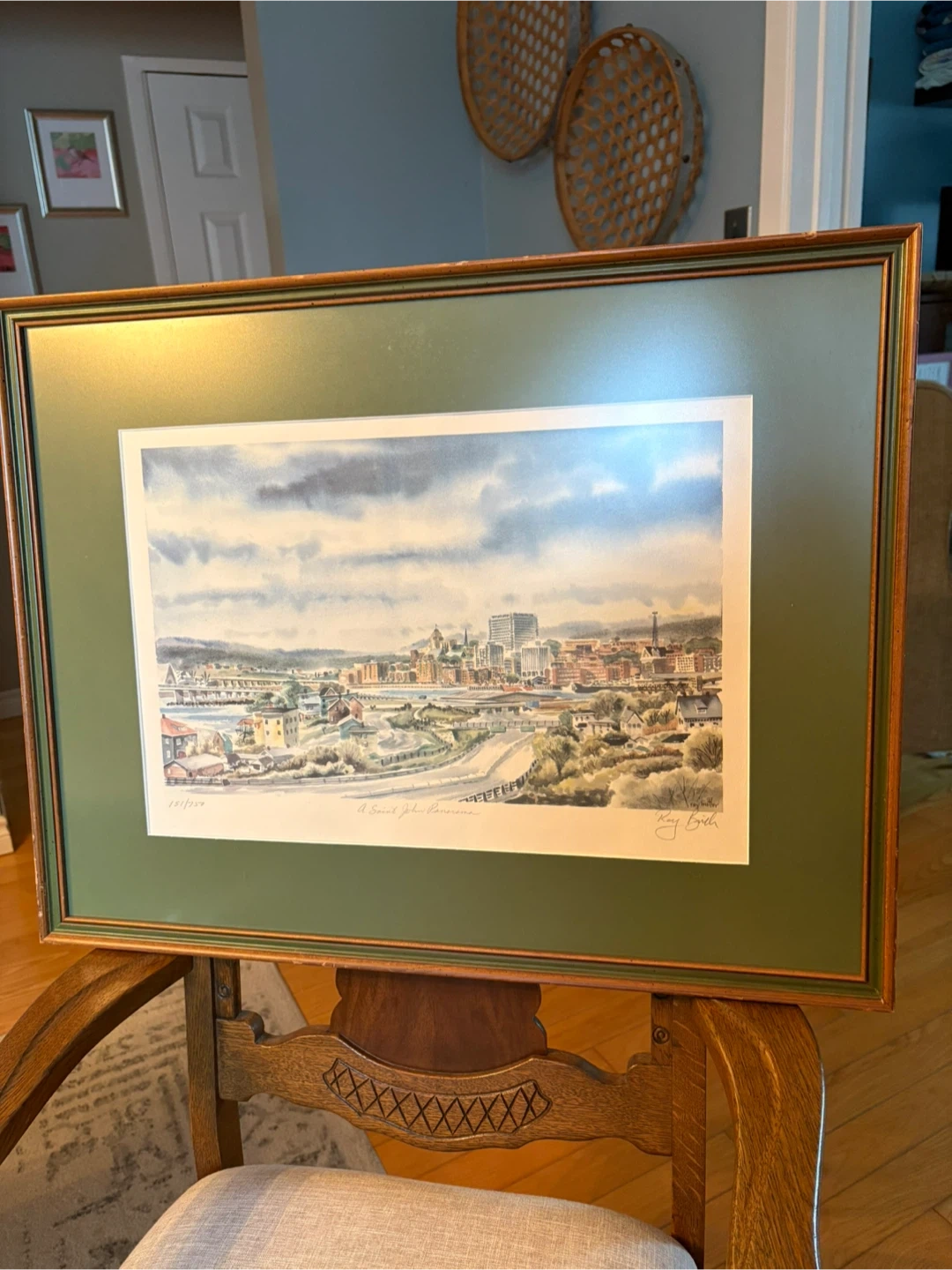This is a framed art print titled "A Saint John Panorama" by artist Ray Butler. It's part of a limited edition run, numbered 131/250. The print showcases a detailed watercolor of the Saint John cityscape. It's signed by the artist. Frame has a few scratches as shown.