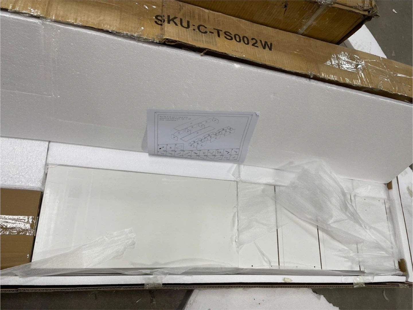 Wall-mounted entertainment unit with three cabinet doors. Dimensions are 63" wide, 9.8" high, and 13.8" deep. Includes LED lighting underneath for ambiance.