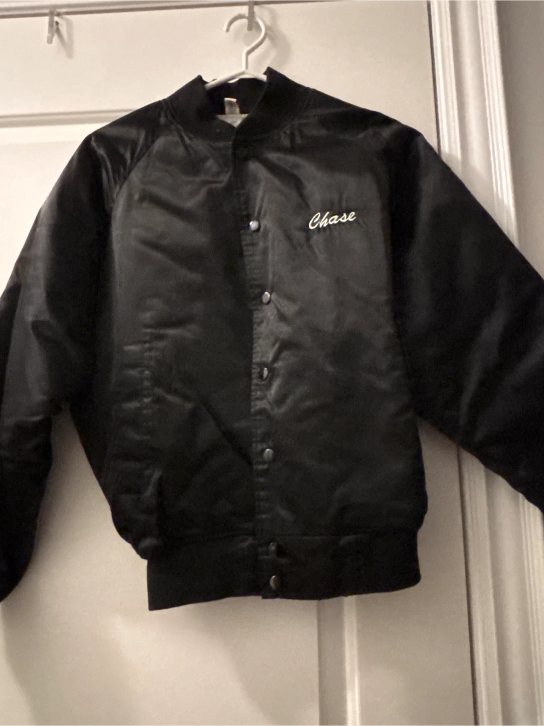 Selling a black jacket from Shane's Martial Arts Institute. It features the institute's logo on the back and the name 'Chase' embroidered on the front. A unique vintage piece.