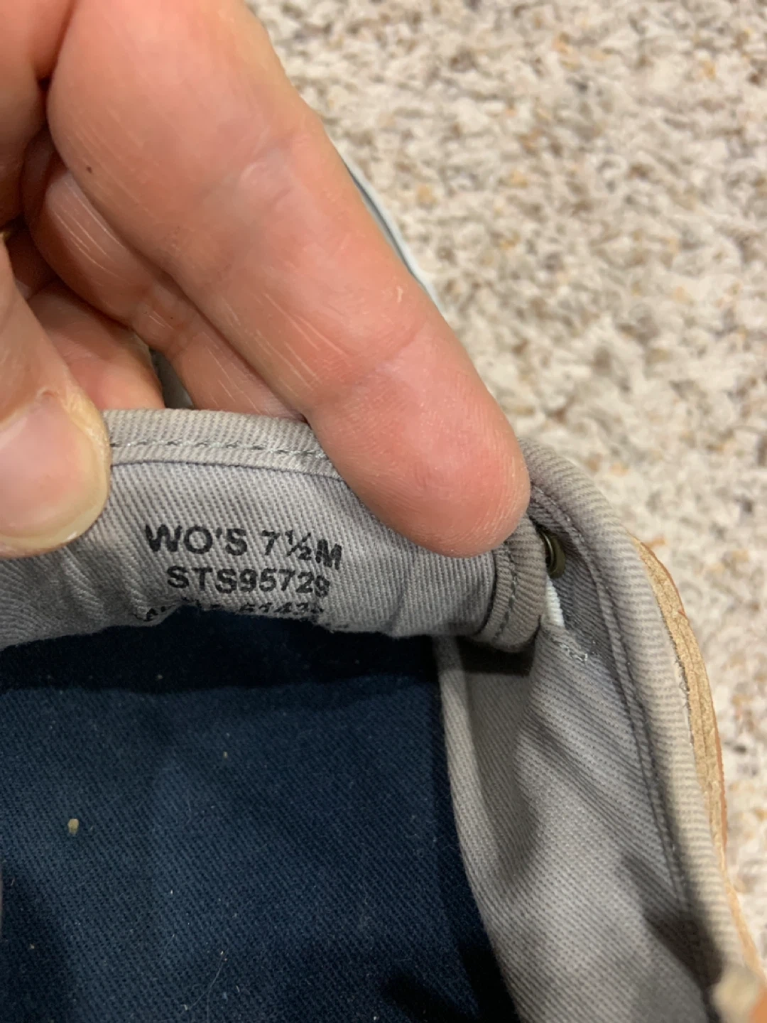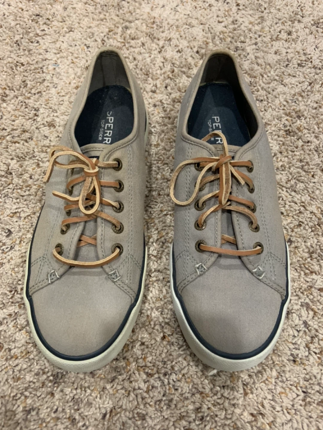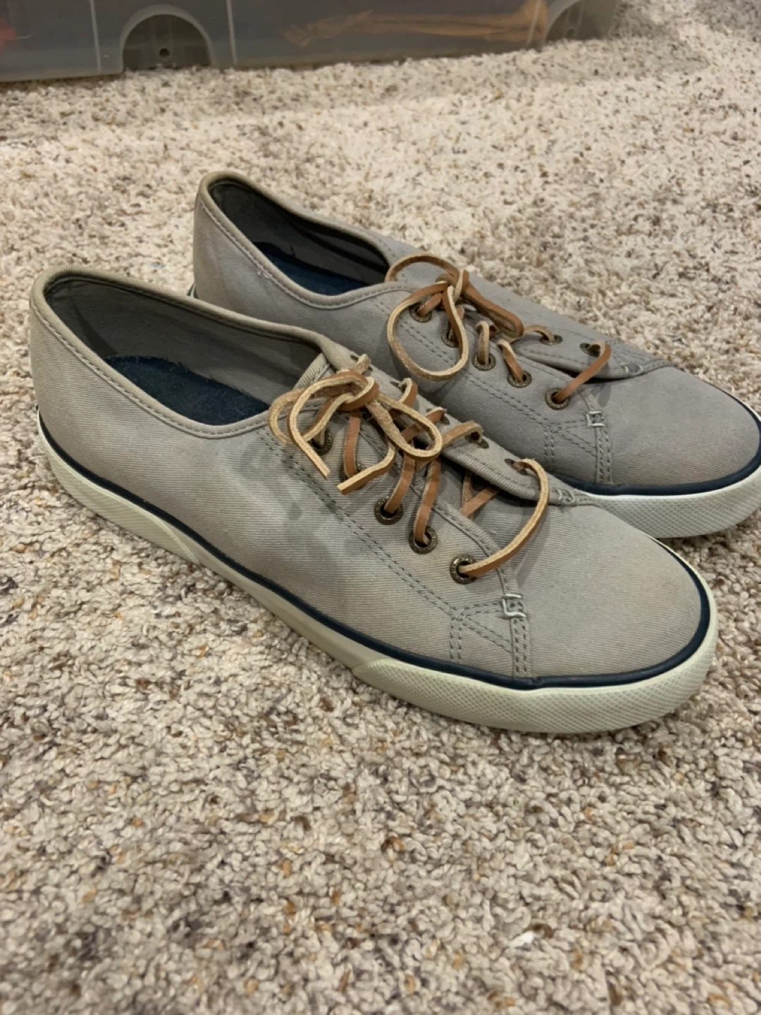 These Sperry Top-Sider sneakers are a light grey canvas with brown leather laces. They feature the classic Sperry branding on the heel. Great for casual wear!