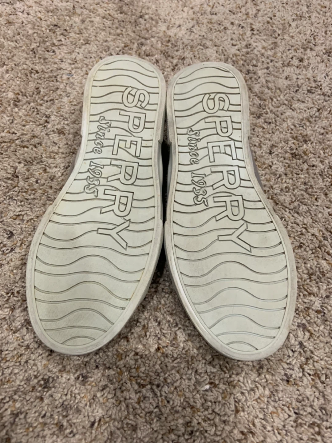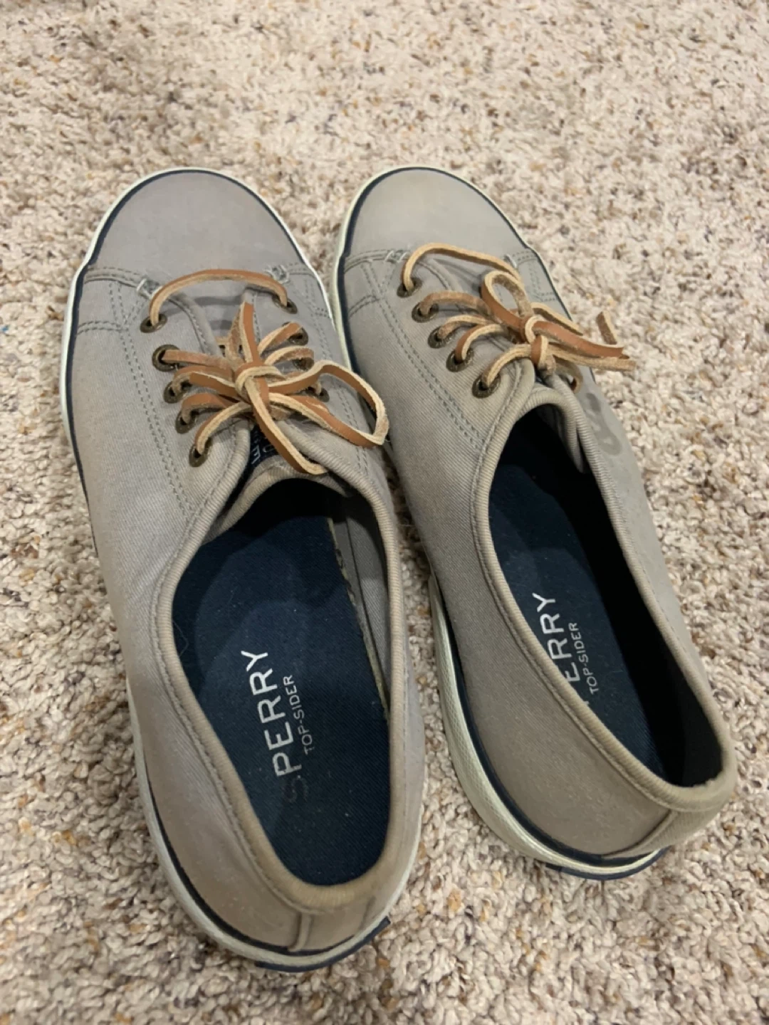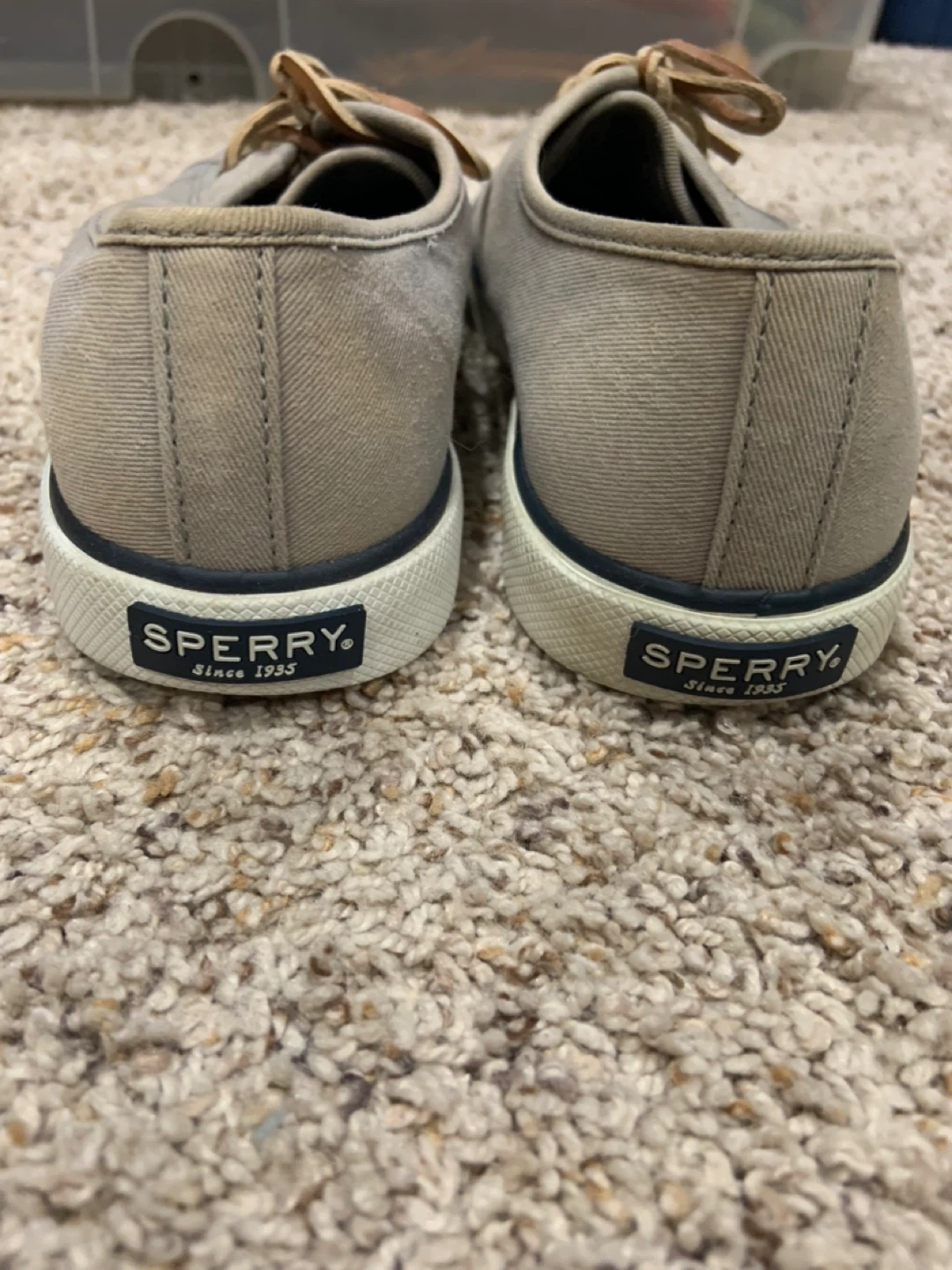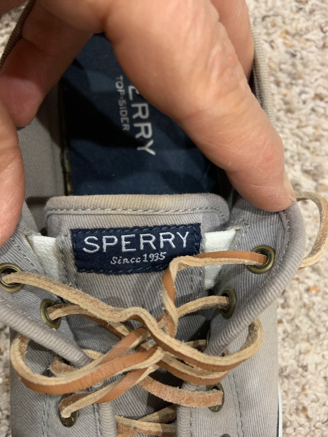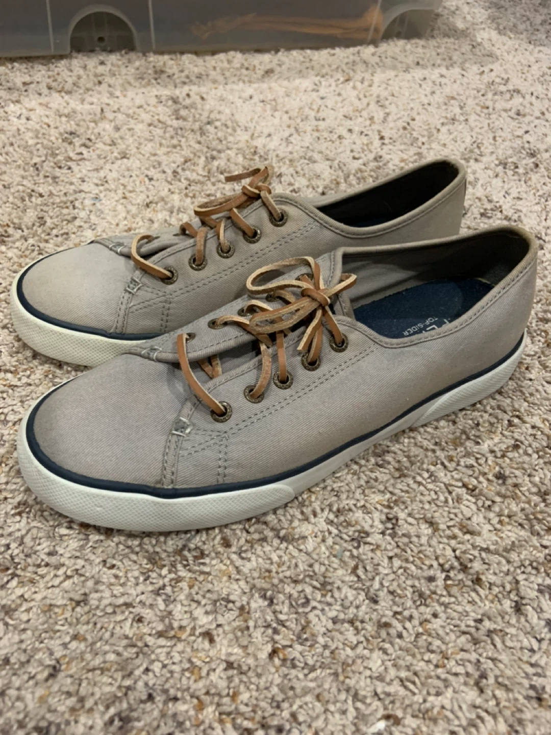These Sperry Top-Sider sneakers are a light grey canvas with brown leather laces. They feature the classic Sperry branding on the heel. Great for casual wear!