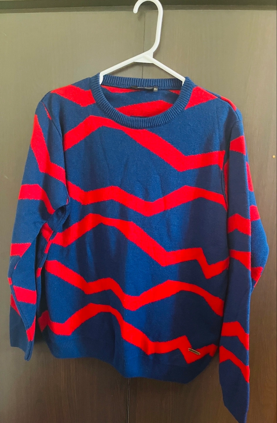 Cozy sweater with a striking blue and red zig-zag pattern! It's an XL size, perfect for staying warm and stylish. The material feels soft and comfortable, great for everyday wear. It's in great condition, ready for a new home!