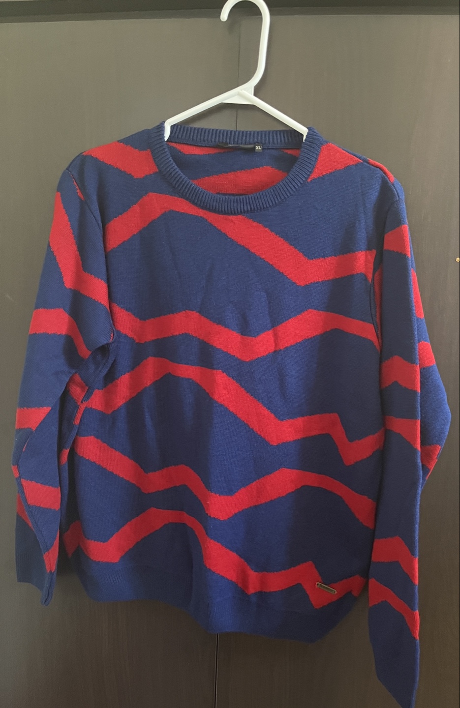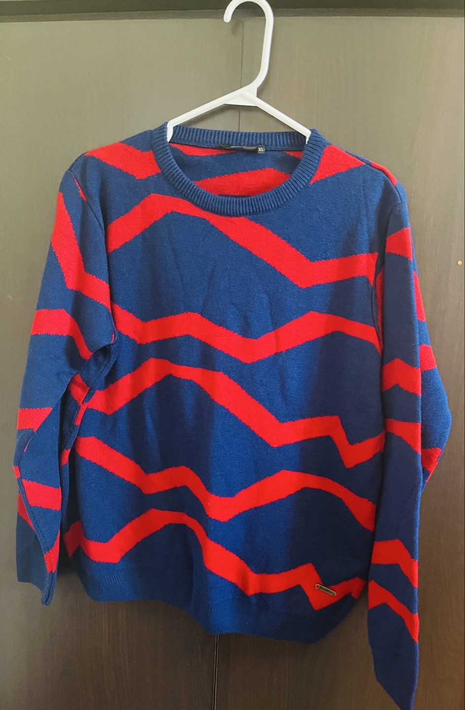 Cozy sweater with a striking blue and red zig-zag pattern! It's an XL size, perfect for staying warm and stylish. The material feels soft and comfortable, great for everyday wear. It's in great condition, ready for a new home!