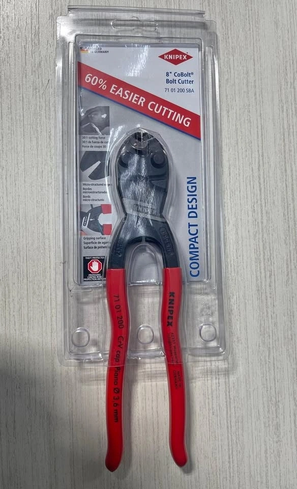 Brand new with box. Model: 71 01 200 SBA. Retail Price: $98+ tax = $110.74. Seller Price: $80. Pickup location: Islington and Rexdale, Etobicoke. Cash only. An all-around tool for the toughest demands, this Knipex high-leverage CoBolt cutter features a lever action design that applies 20 times more hand force for superior cutting power with less effort. This mini bolt cutter can cut through more than you ever thought possible up to 1/4-inch diameter with ease. It's ideal for automotive or construction applications, cutting cotter pins and nails, repeated use in factory assembly lines, cutting wire fencing in agricultural settings, or even everyday tasks such as cutting floral wire or fish hooks. Forged from chrome vanadium electric steel, these cutters are built to last. This lightweight cutter features precision-matched cutting edges for cutting soft or hard steel. It also features gripping jaws below the joint for gripping and pulling nails and wires.