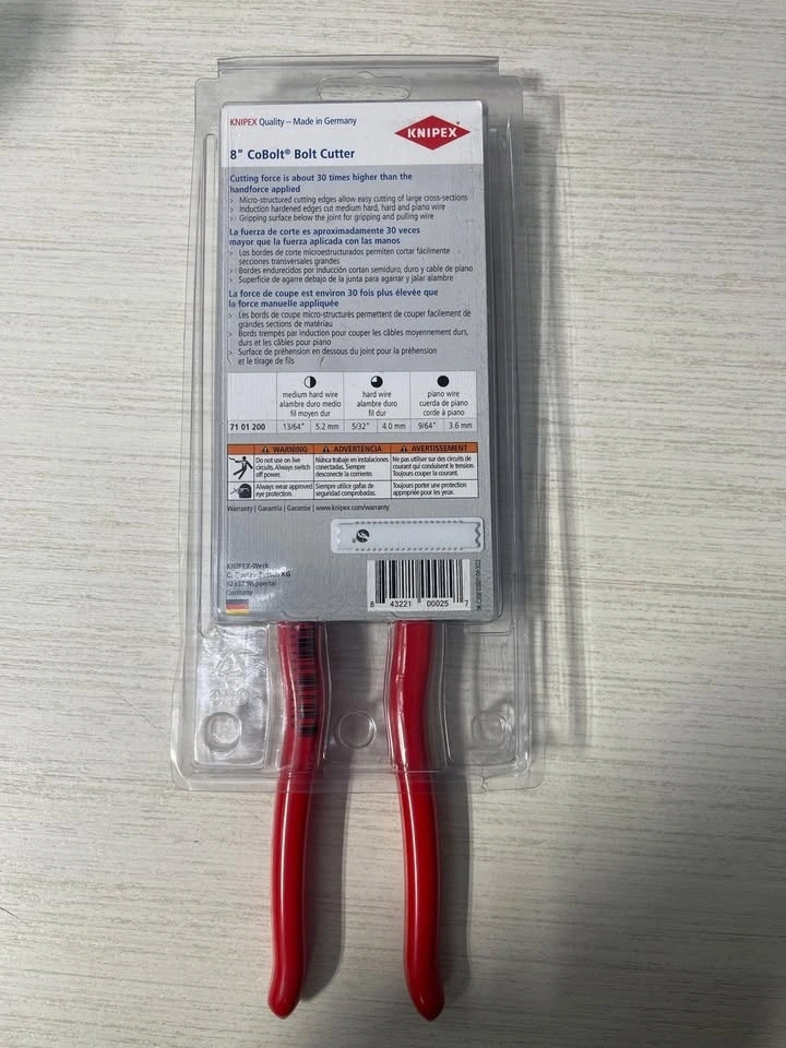 Brand new with box. Model: 71 01 200 SBA. Retail Price: $98+ tax = $110.74. Seller Price: $80. Pickup location: Islington and Rexdale, Etobicoke. Cash only. An all-around tool for the toughest demands, this Knipex high-leverage CoBolt cutter features a lever action design that applies 20 times more hand force for superior cutting power with less effort. This mini bolt cutter can cut through more than you ever thought possible up to 1/4-inch diameter with ease. It's ideal for automotive or construction applications, cutting cotter pins and nails, repeated use in factory assembly lines, cutting wire fencing in agricultural settings, or even everyday tasks such as cutting floral wire or fish hooks. Forged from chrome vanadium electric steel, these cutters are built to last. This lightweight cutter features precision-matched cutting edges for cutting soft or hard steel. It also features gripping jaws below the joint for gripping and pulling nails and wires.