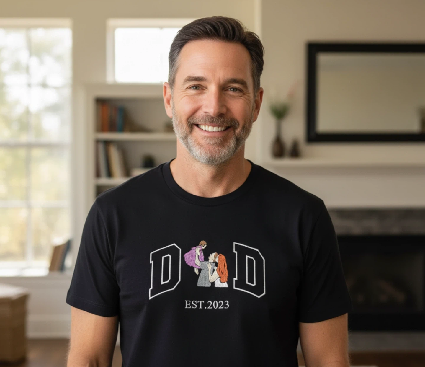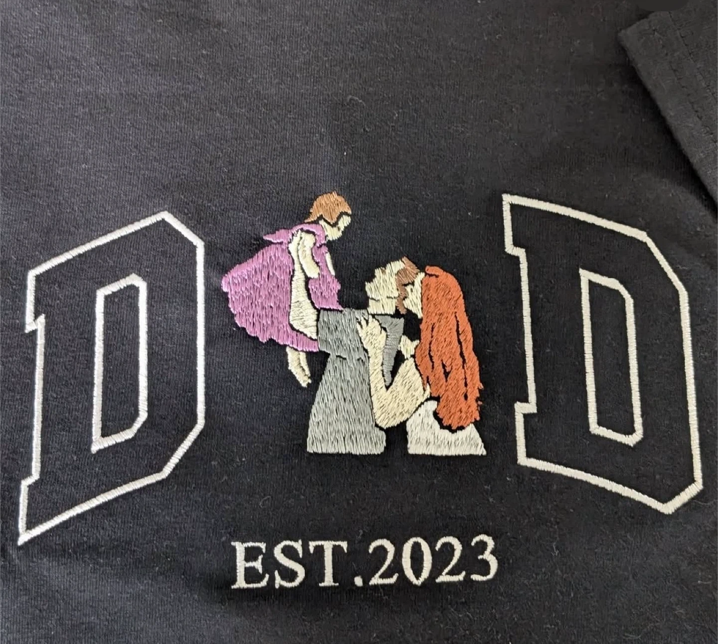 It features the word "DAD" or "MOM" with a heartwarming family portrait and "EST. 2023" below.