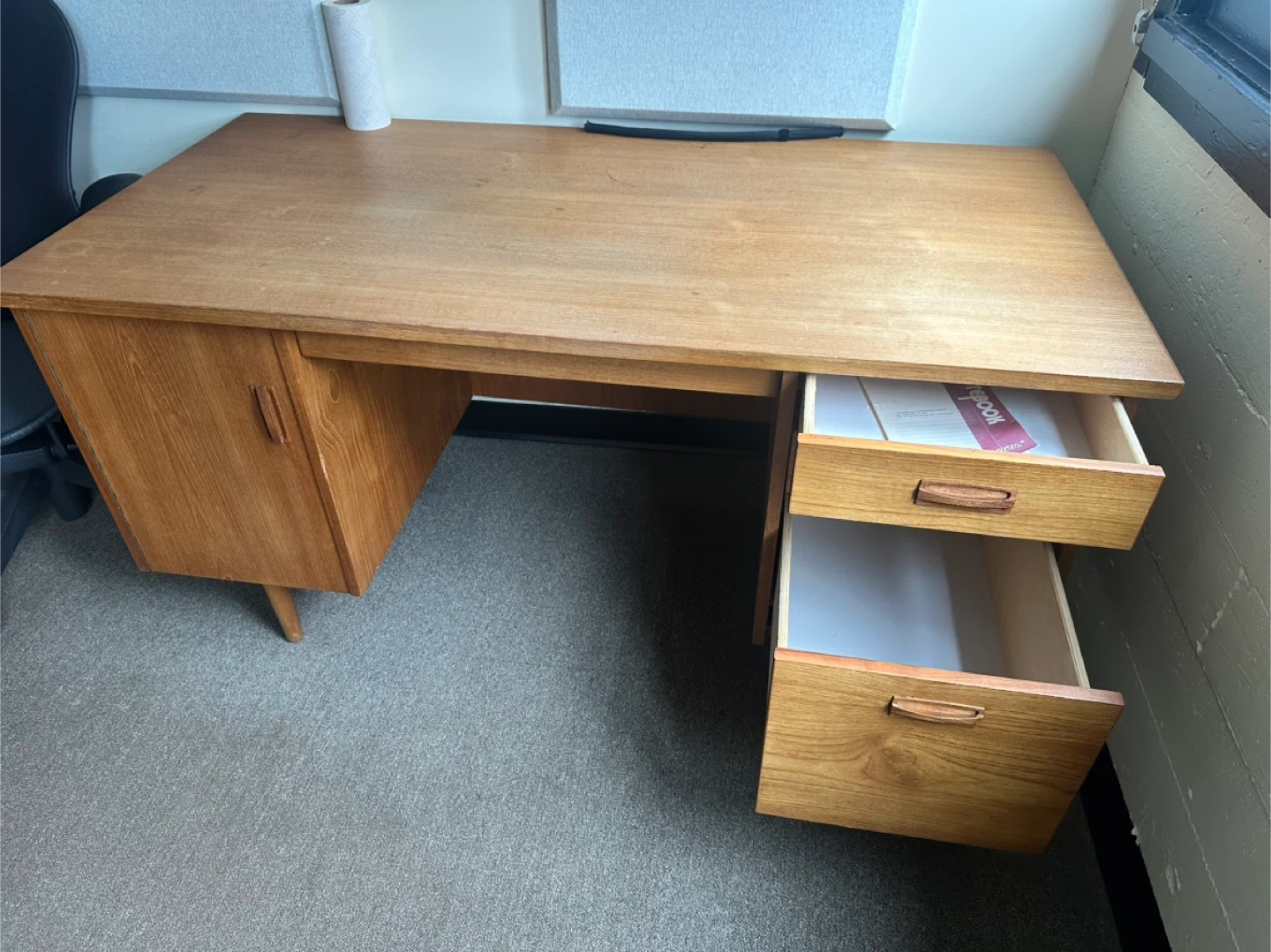 This is a vintage wooden desk with ample storage space. It features a cabinet and drawers for organization. This desk is perfect for a home office or study.
