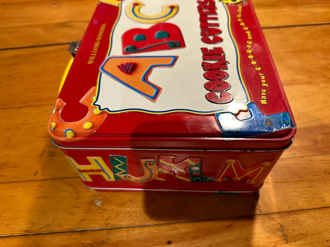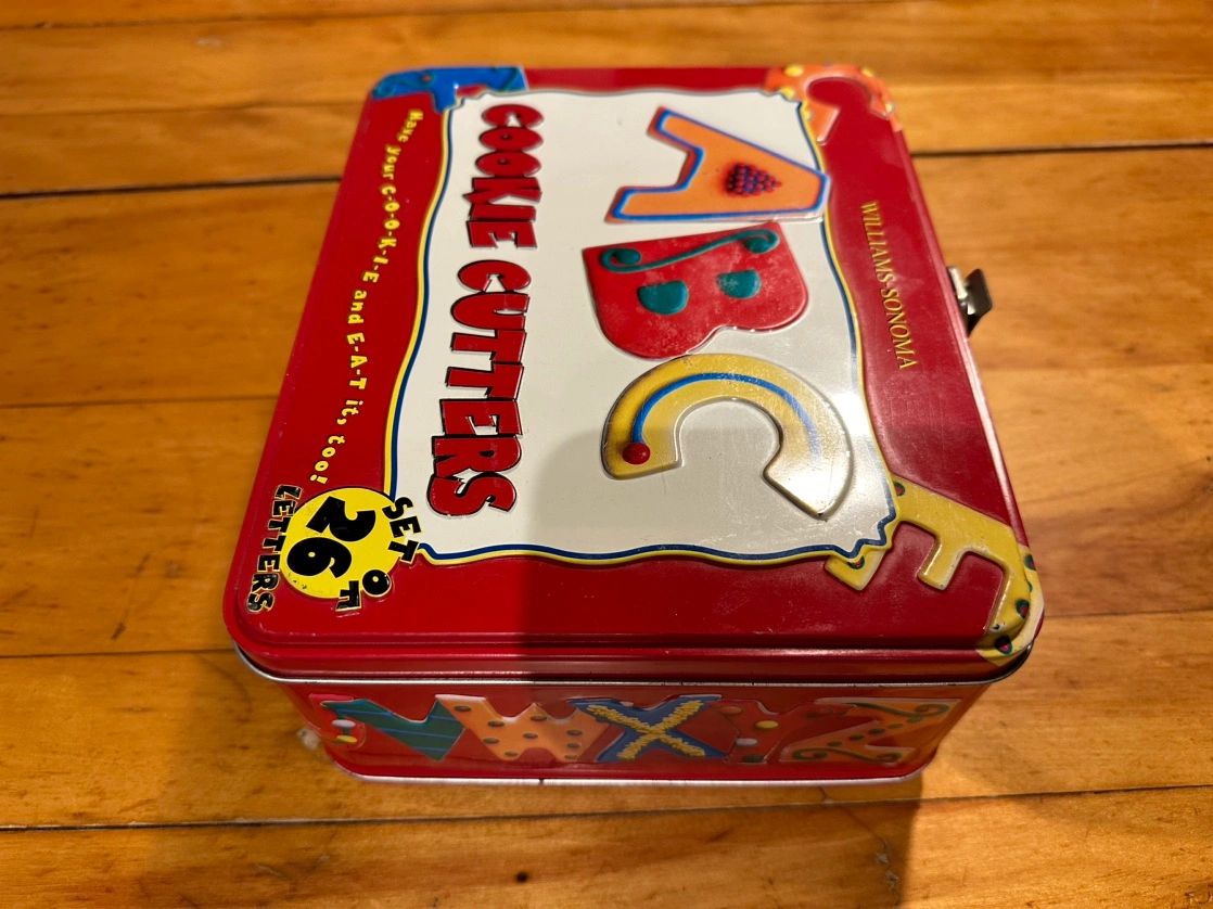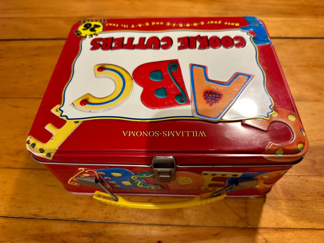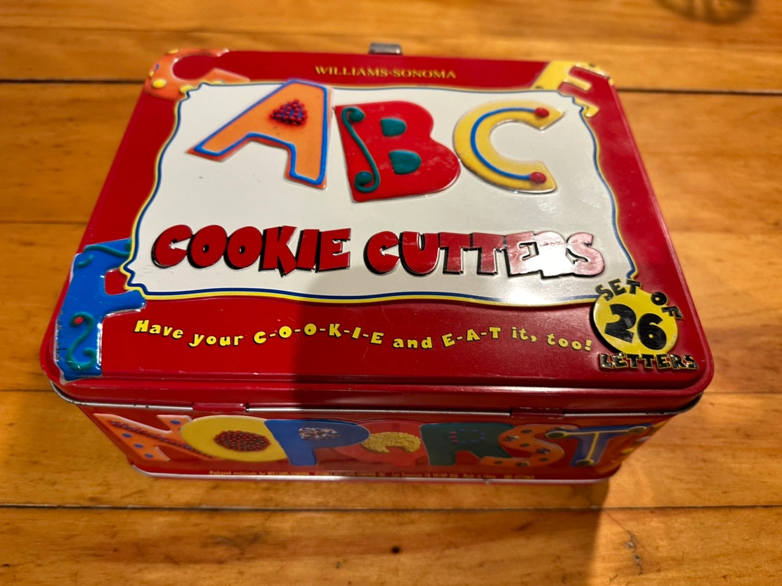 Cute retro alphabet cookie cutter set, and a convenient metal storage tin (with a tasty sugar cookie recipe on the back).
