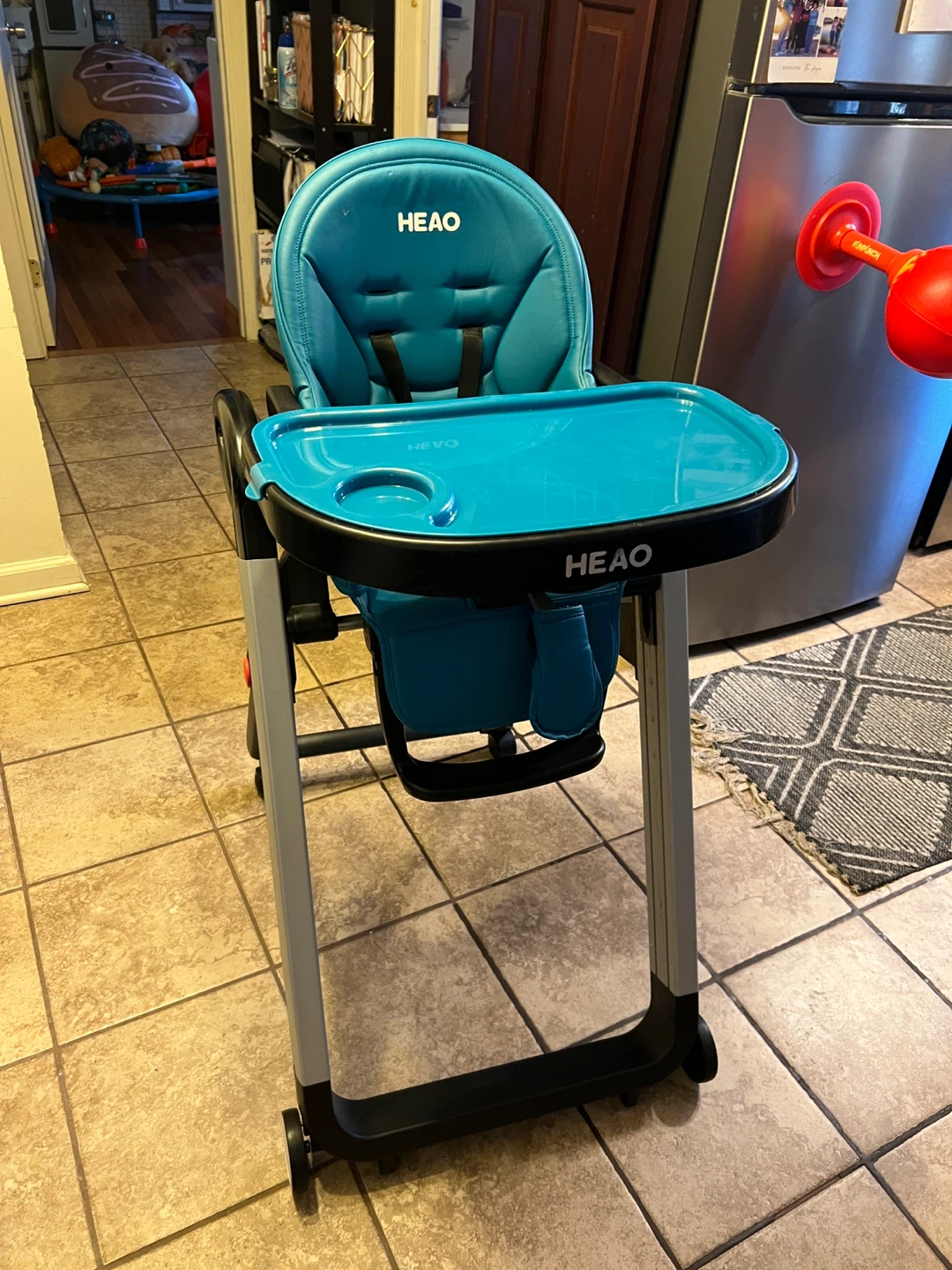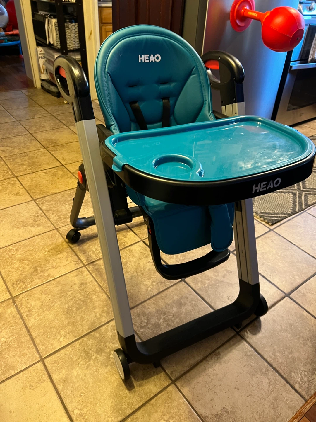 Modern HEAO high chair in beautiful teal color. Very sturdy with a wide, stable base and smooth-rolling back wheels for easy movement. Features a padded seat with safety harness, large removable tray with cup holder, and easy-wipe surfaces for quick cleanups.