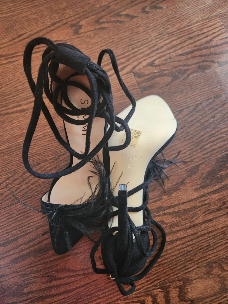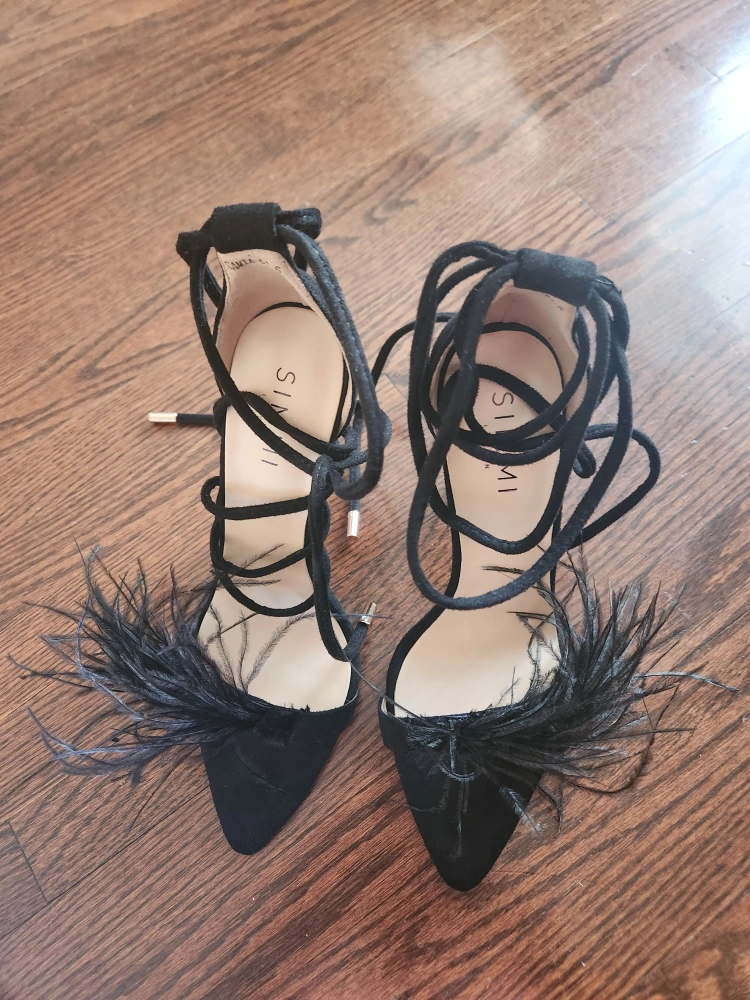 Stunning black suede heels. Feature delicate feather detailing and lace-up ankle closure. High heels. New in box.