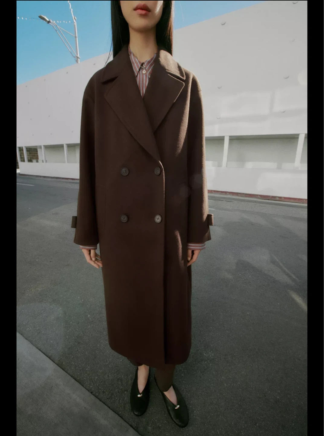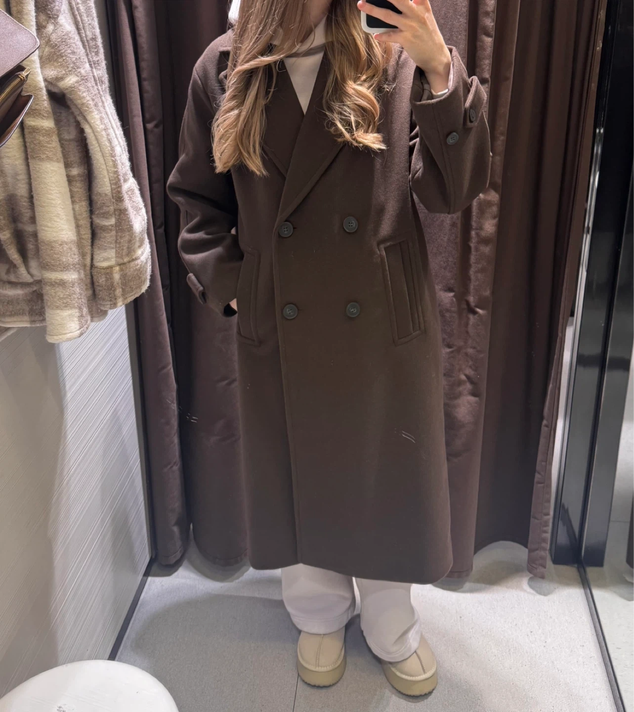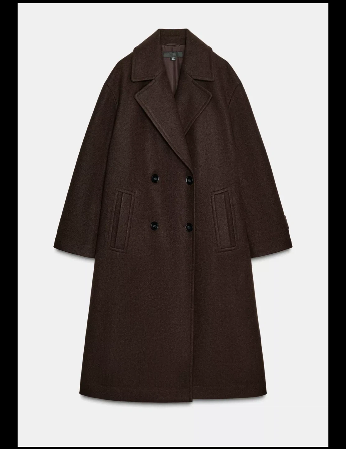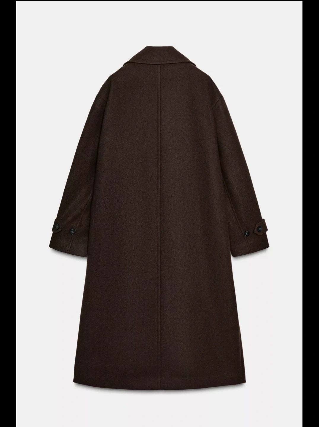 Here's a stylish Zara coat in a beautiful brown colour! It's a wool blend and features a classic double-breasted design. Perfect for adding a touch of sophistication to your wardrobe