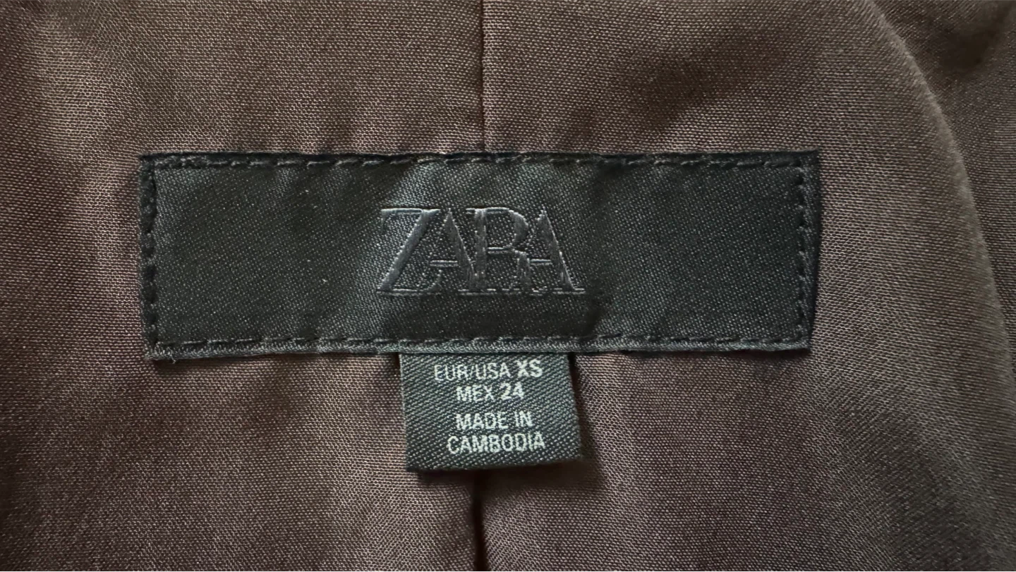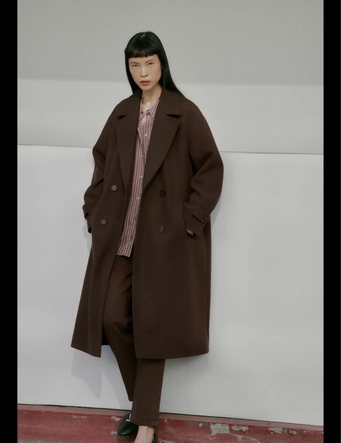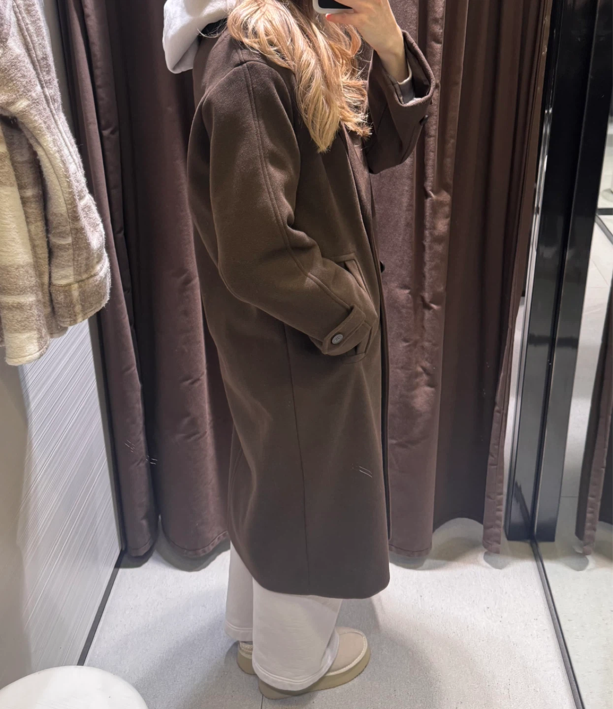 Here's a stylish Zara coat in a beautiful brown colour! It's a wool blend and features a classic double-breasted design. Perfect for adding a touch of sophistication to your wardrobe
