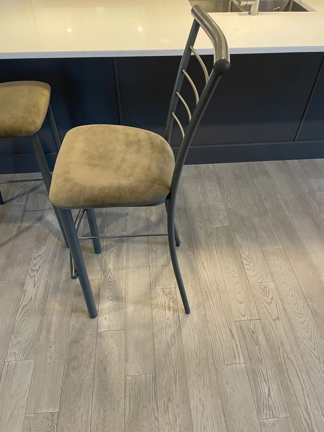 Selling two bar stools with a backrest. Velvet olive green top dark grey metal frame. They are in new condition and ready for a new kitchen or bar area.Purchased them from Konto store paid over $350 each asking 125 each