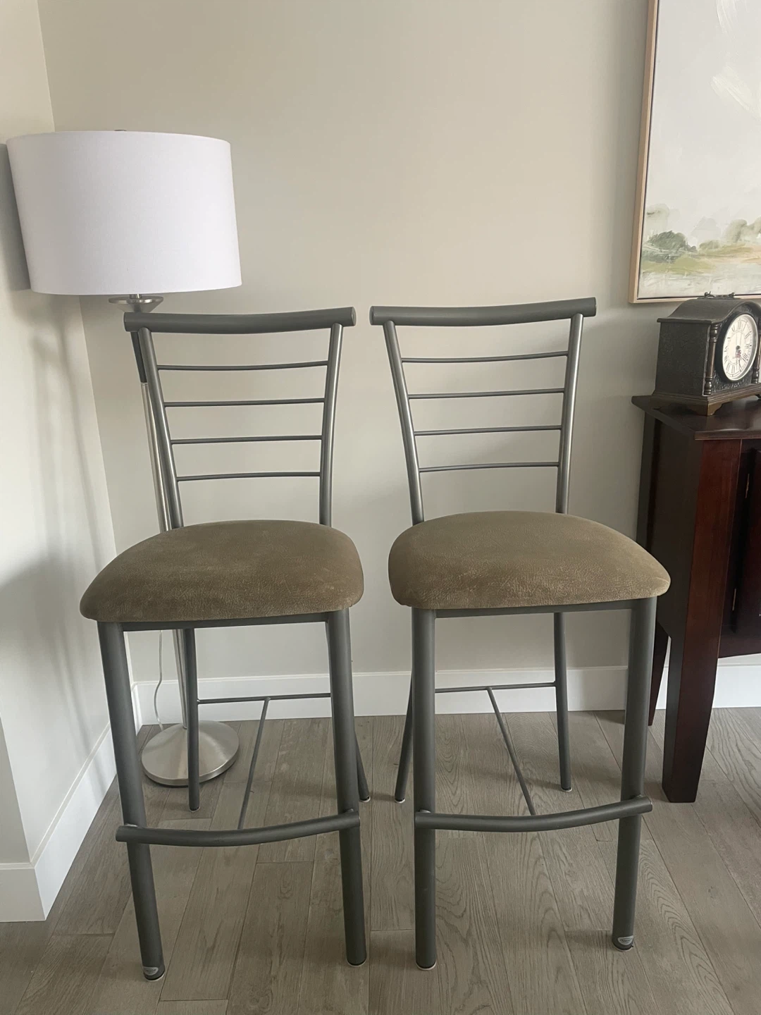 Selling two bar stools with a backrest. Velvet olive green top dark grey metal frame. They are in new condition and ready for a new kitchen or bar area.Purchased them from Konto store paid over $350 each asking 125 each