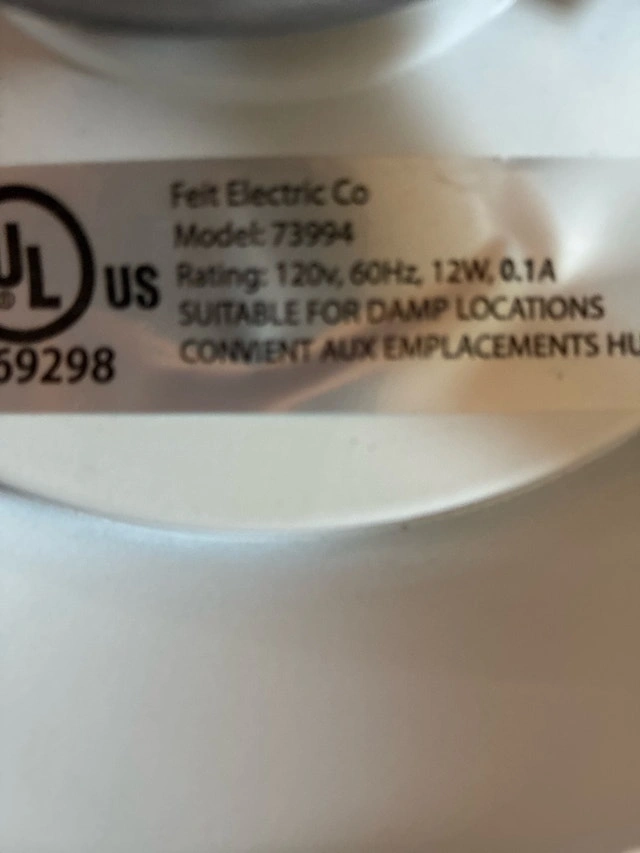 This is a used Feit Electric Co ceiling light, Model 73994, suitable for damp locations with a rating of 120V, 60Hz, and 12W. It's in good working condition and ready to brighten up your space.