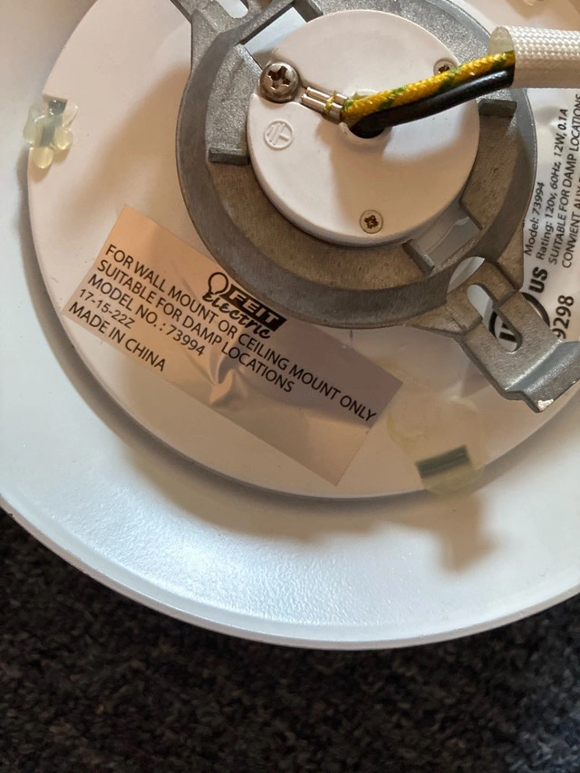 This is a used Feit Electric Co ceiling light, Model 73994, suitable for damp locations with a rating of 120V, 60Hz, and 12W. It's in good working condition and ready to brighten up your space.