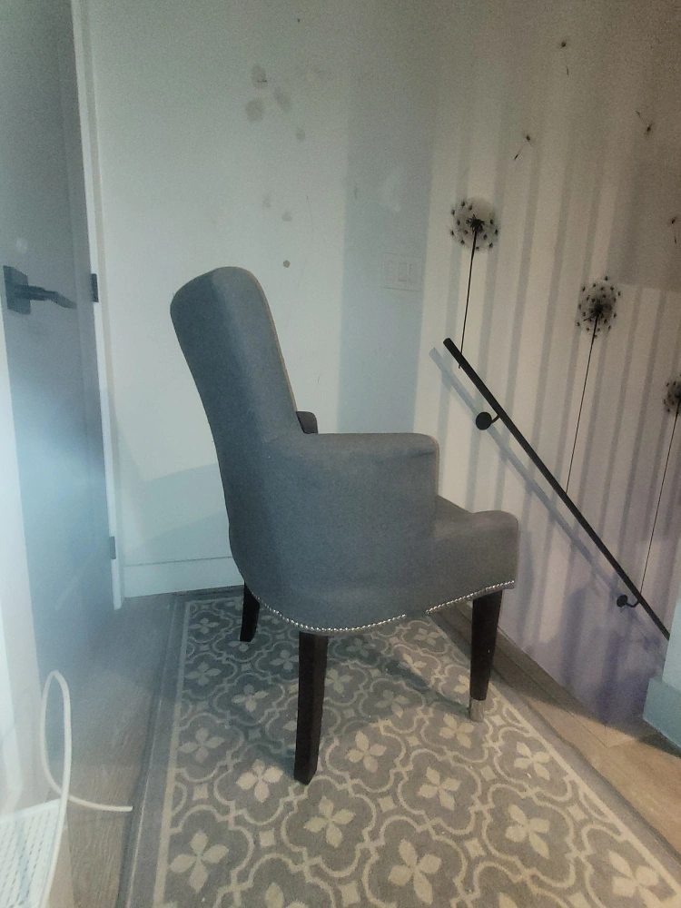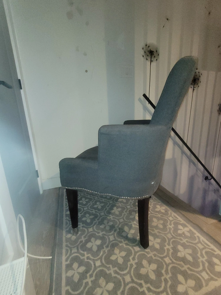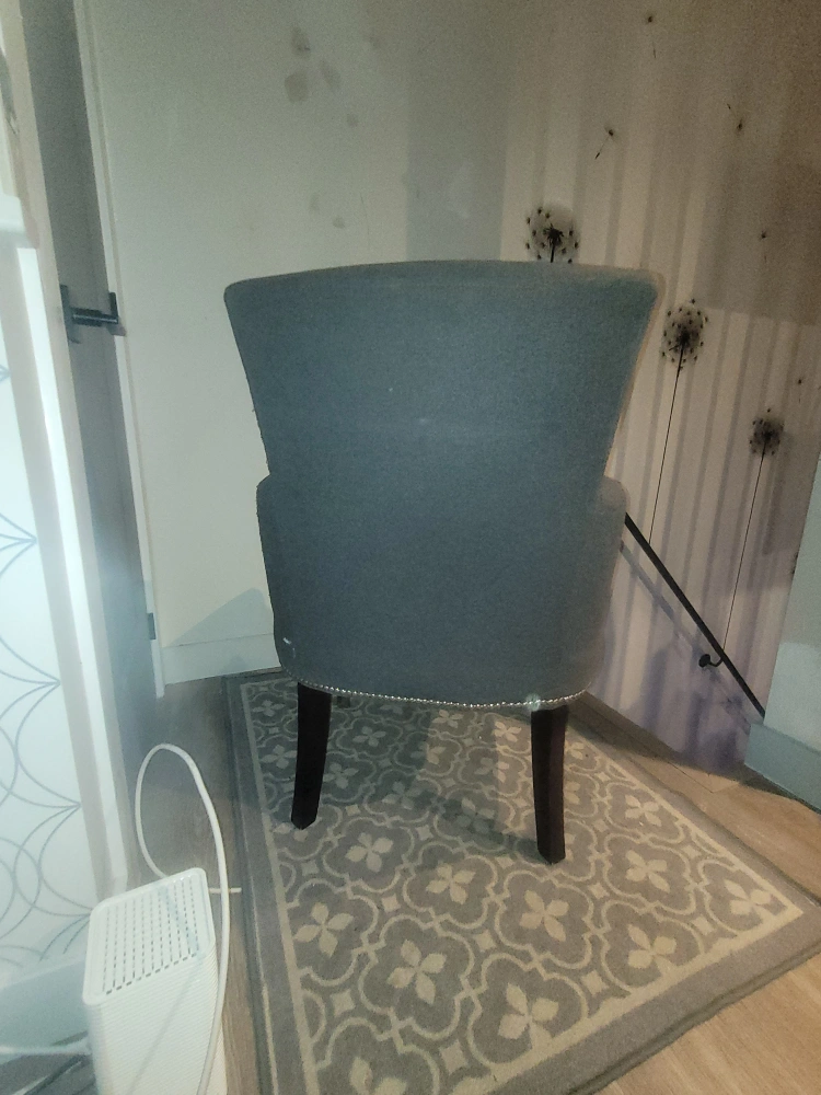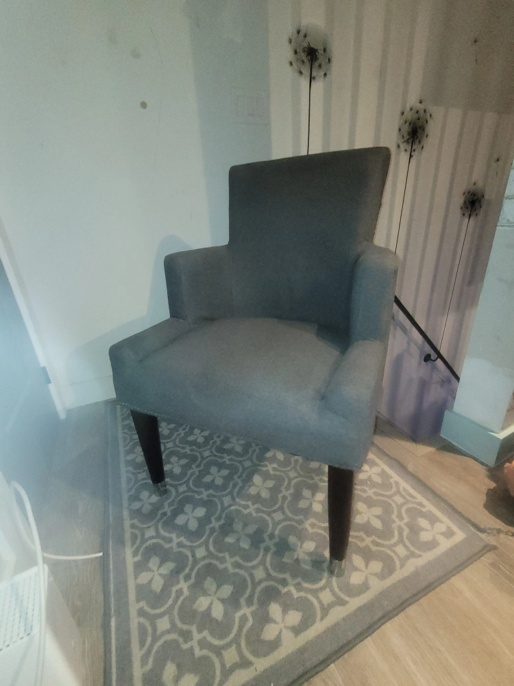 2 Grey Sitting Chairs High back with metal studded edging. Both chairs in good condition. Slight wear on back fabric of one chair.