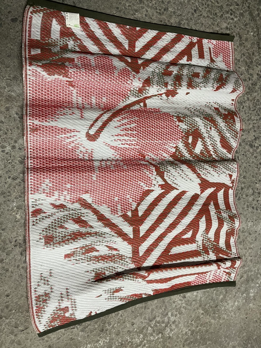 Selling a woven mat with a red and white pattern. It's in great shape and would be perfect for indoor or outdoor use!