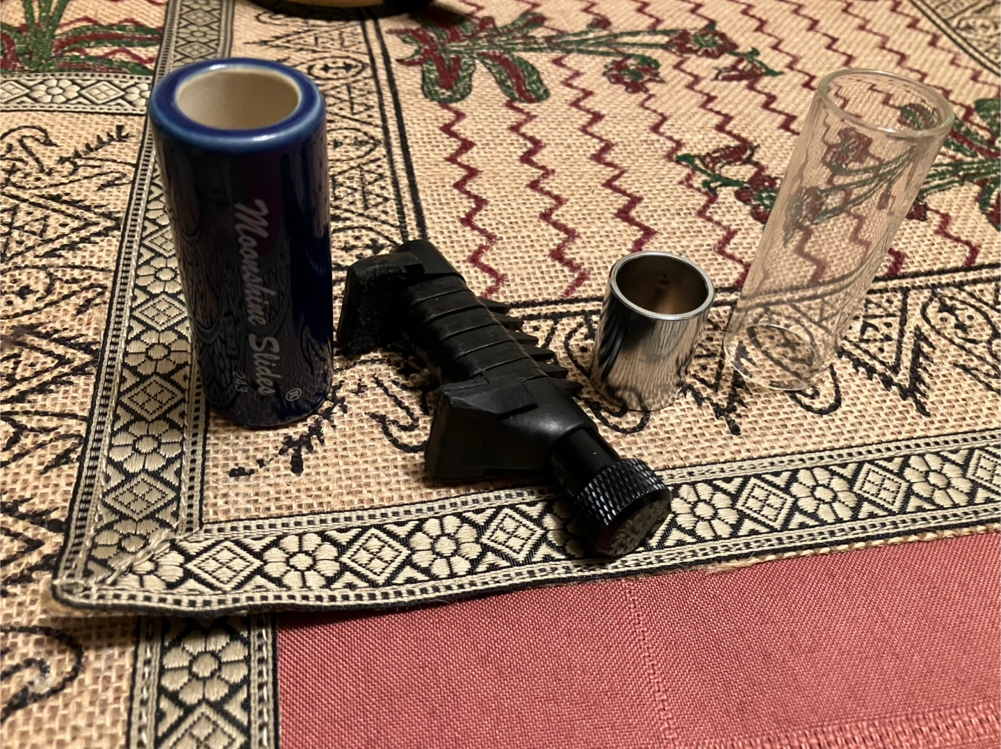 Selling a variety of guitar slides and accessories. Includes a Moonshine Slides ceramic slide, a metal slide, a glass slide, and a black accessory.