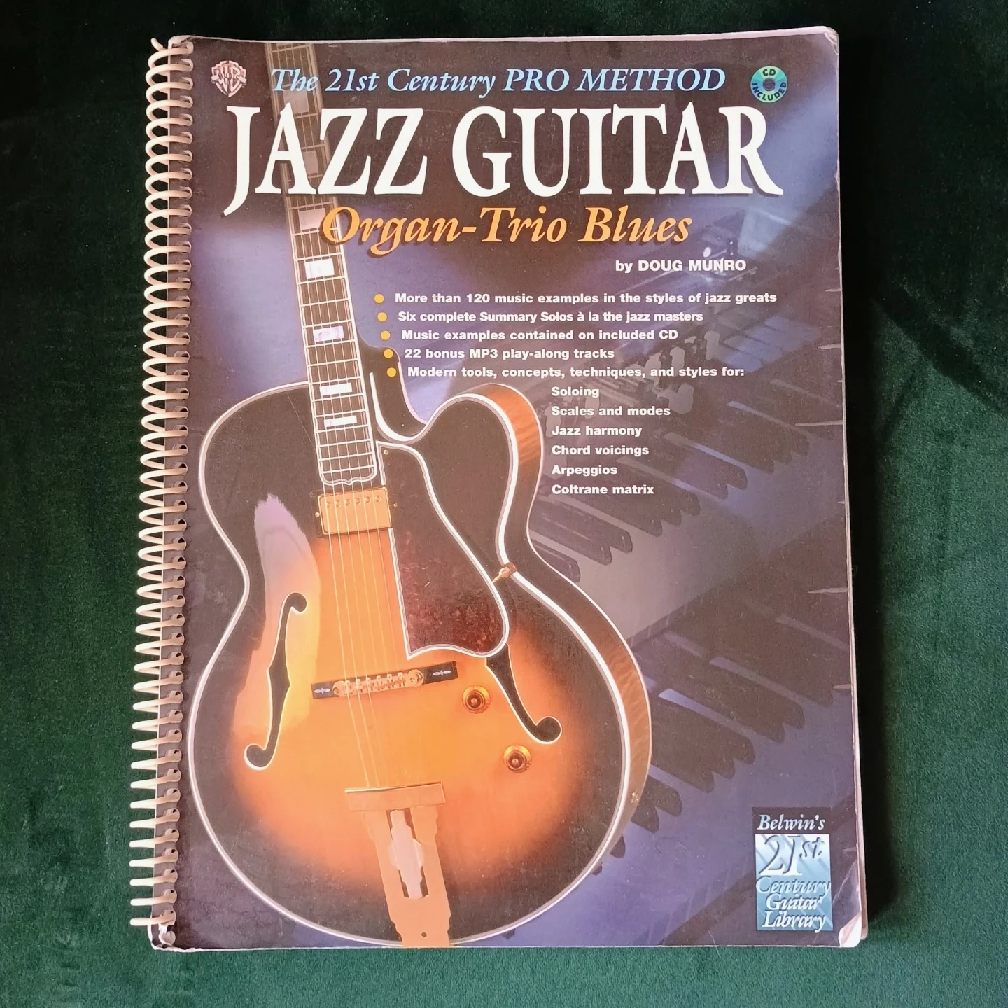 This book covers the 21st Century PRO METHOD for Jazz Guitar, focusing on Organ-Trio Blues. It includes over 120 music examples, six complete summary solos, and music examples on an included CD. Also comes with 22 bonus MP3 play-along tracks covering soloing, scales, jazz harmony, chord voicings, arpeggios, and the Coltrane matrix.