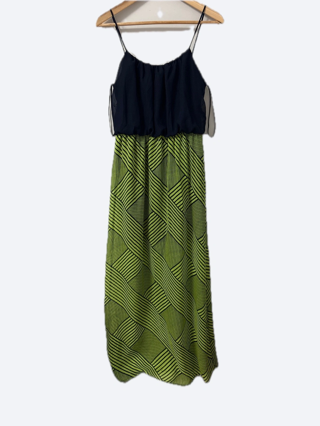 Beautiful summer dress. Features a black chiffon bodice and a lime green geometric print skirt. Spaghetti straps. Midi length.