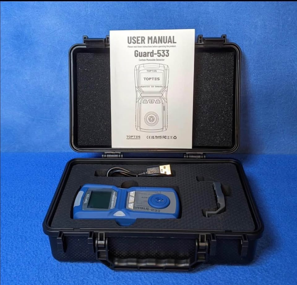 Complete TOPTES GUARD-533 carbon monoxide detector kit. Comes with the detector, user manual, and USB charging cable. Has multiple alarm modes, sound, light, and vibration. Explosion-proof and long battery life. All comes in a protective hard case.
