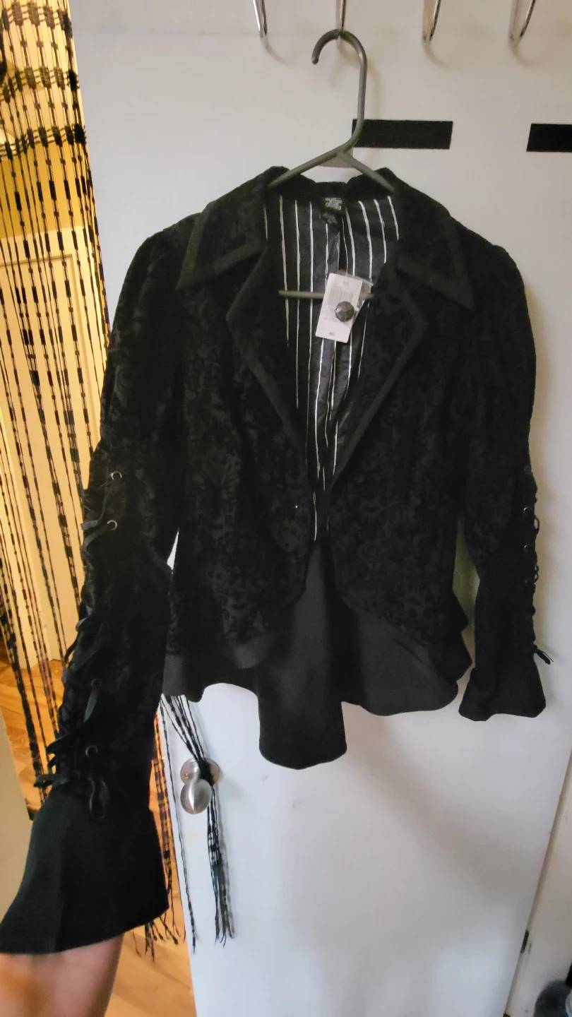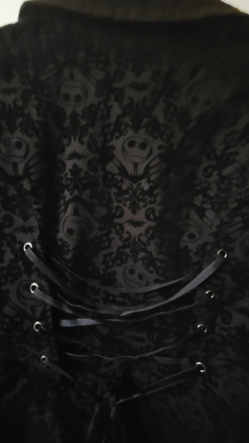 This black velvet jacket features a subtle Jack Skellington pattern throughout. It has a lace-up detail on the sleeves and back. Great for a unique gothic or Halloween-themed look!