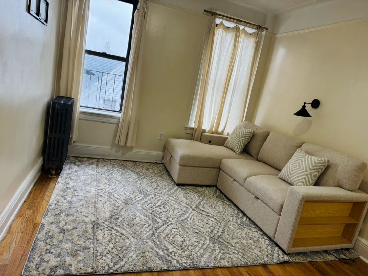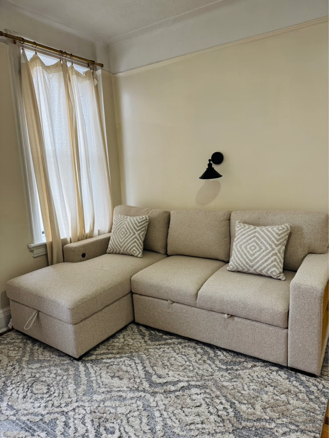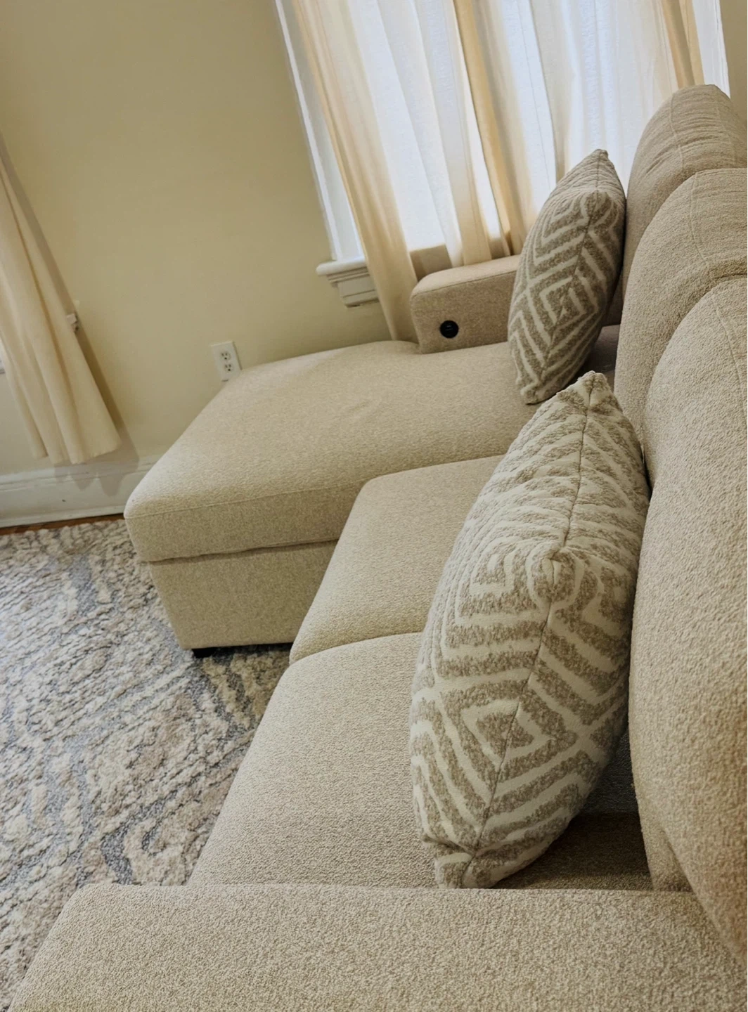 This is a light beige sectional sofa. It comes with two decorative pillows. The ottoman has built-in storage, perfect for blankets or extra pillows!