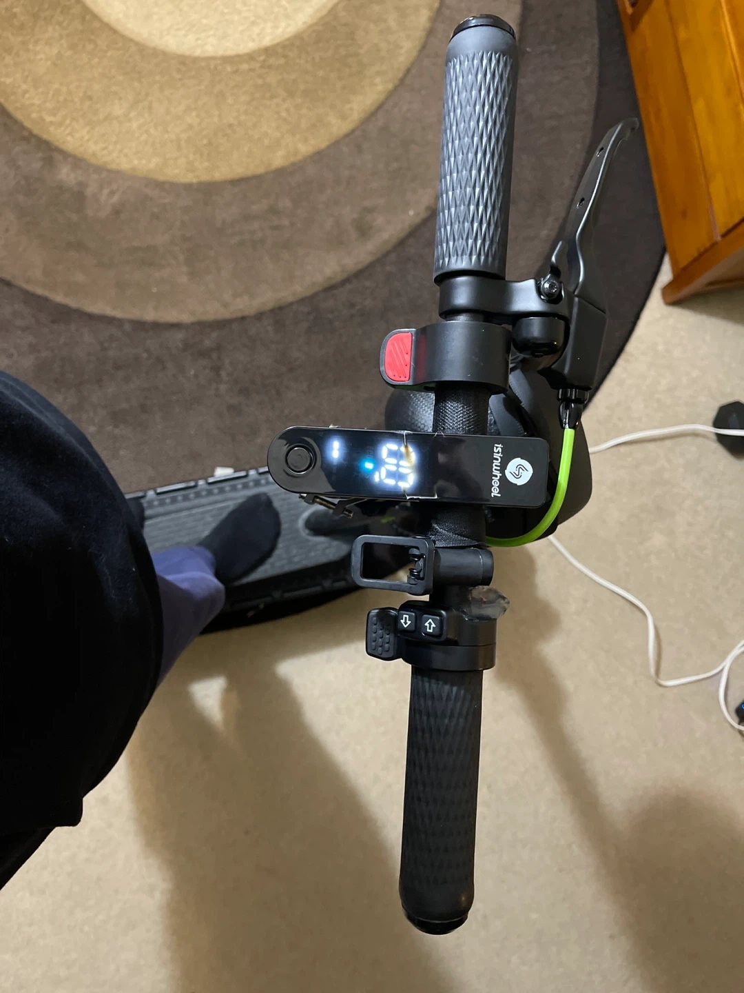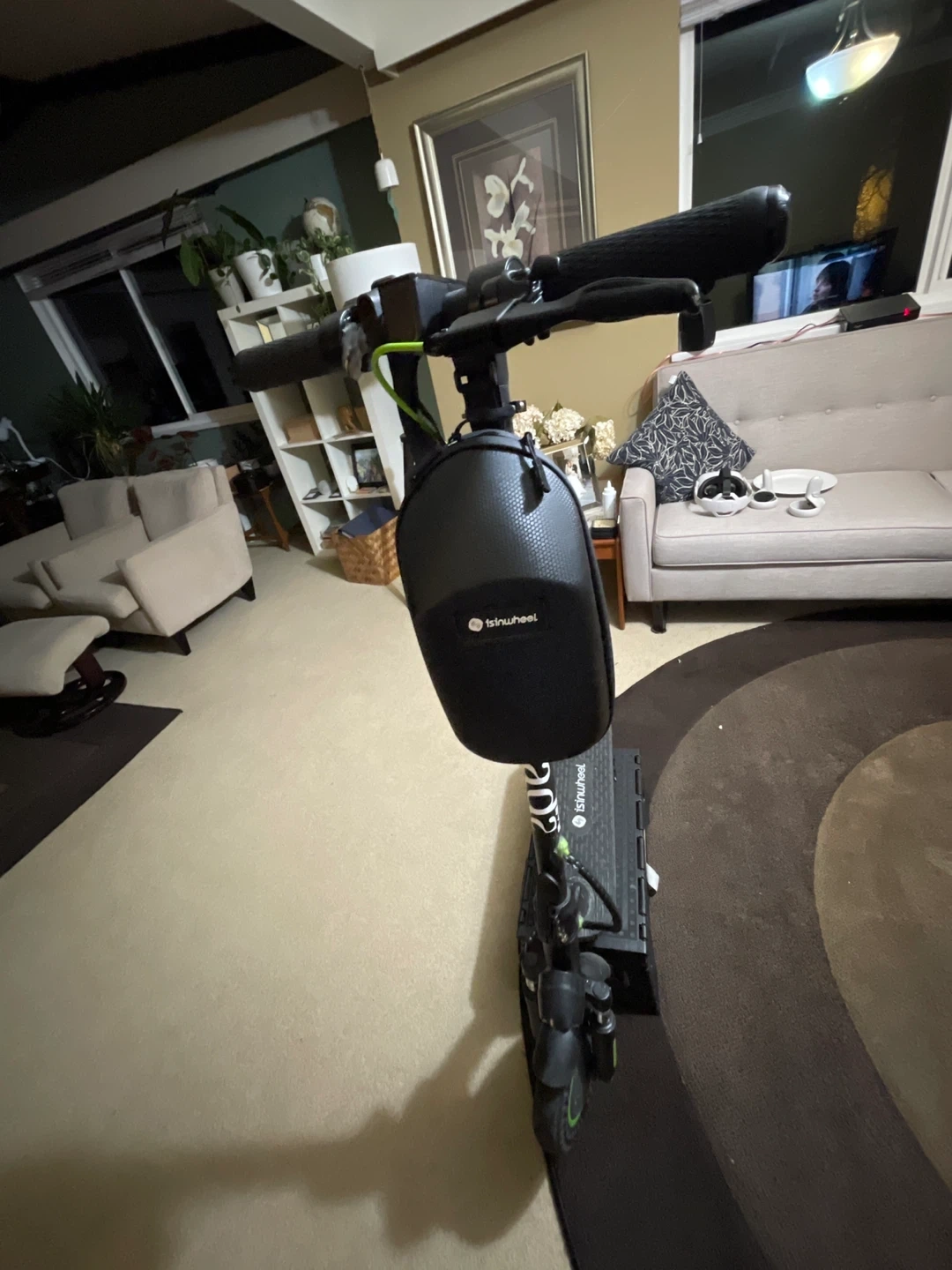 This isinwheel electric scooter is in good working condition. It features a digital display for speed and battery life, a rear brake light and front light . The scooter also comes with a handlebar storage bag and charger.
