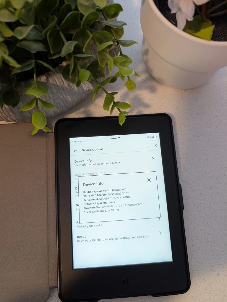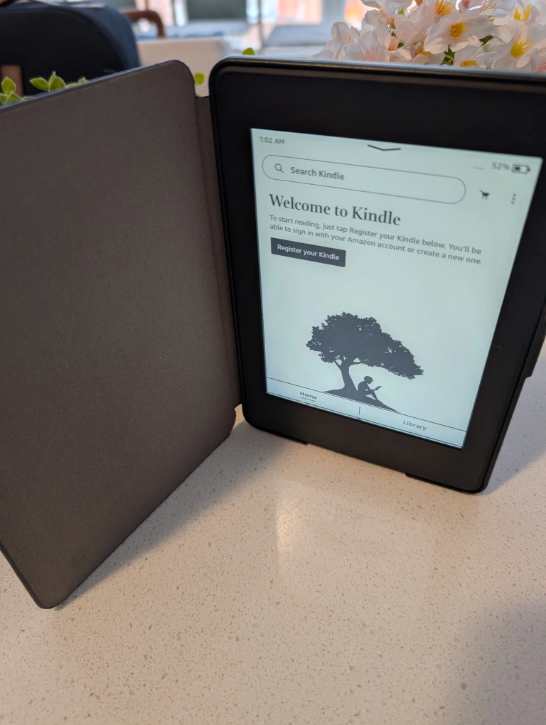 7th generation Kindle Paperwhite. Includes a colourful geometric patterned case.