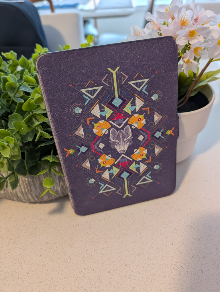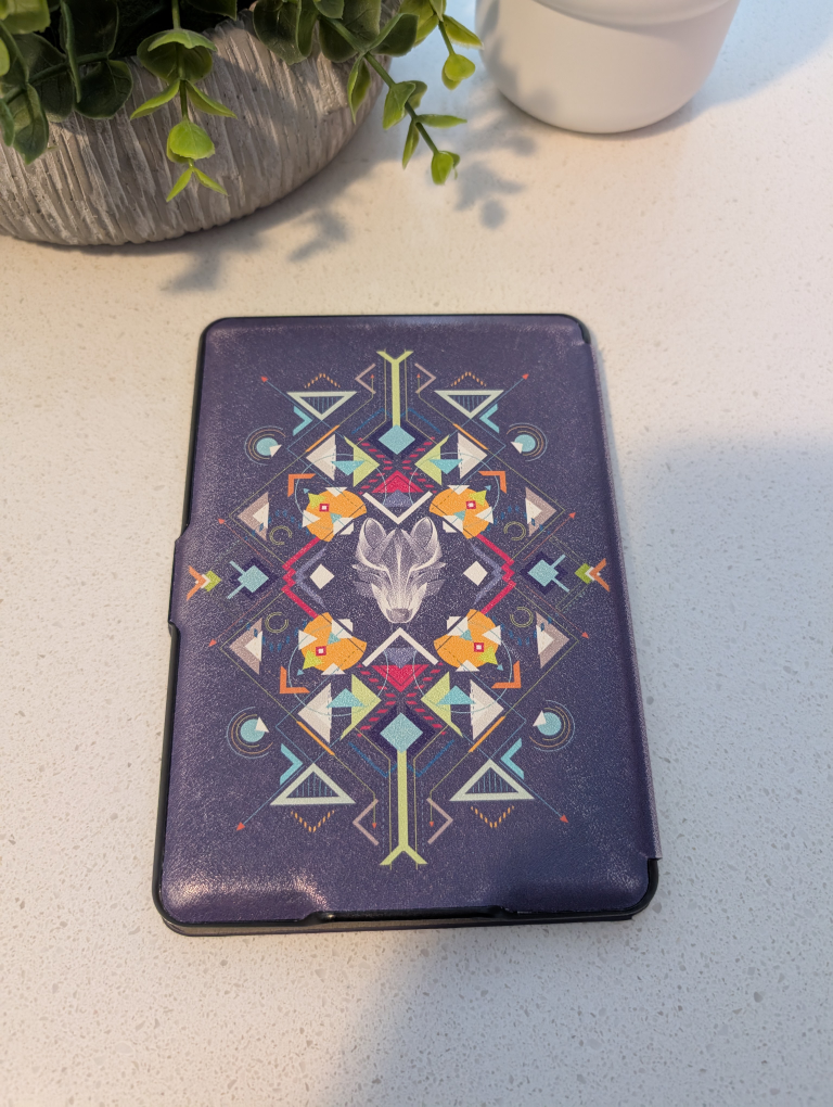 7th generation Kindle Paperwhite. Includes a colourful geometric patterned case.