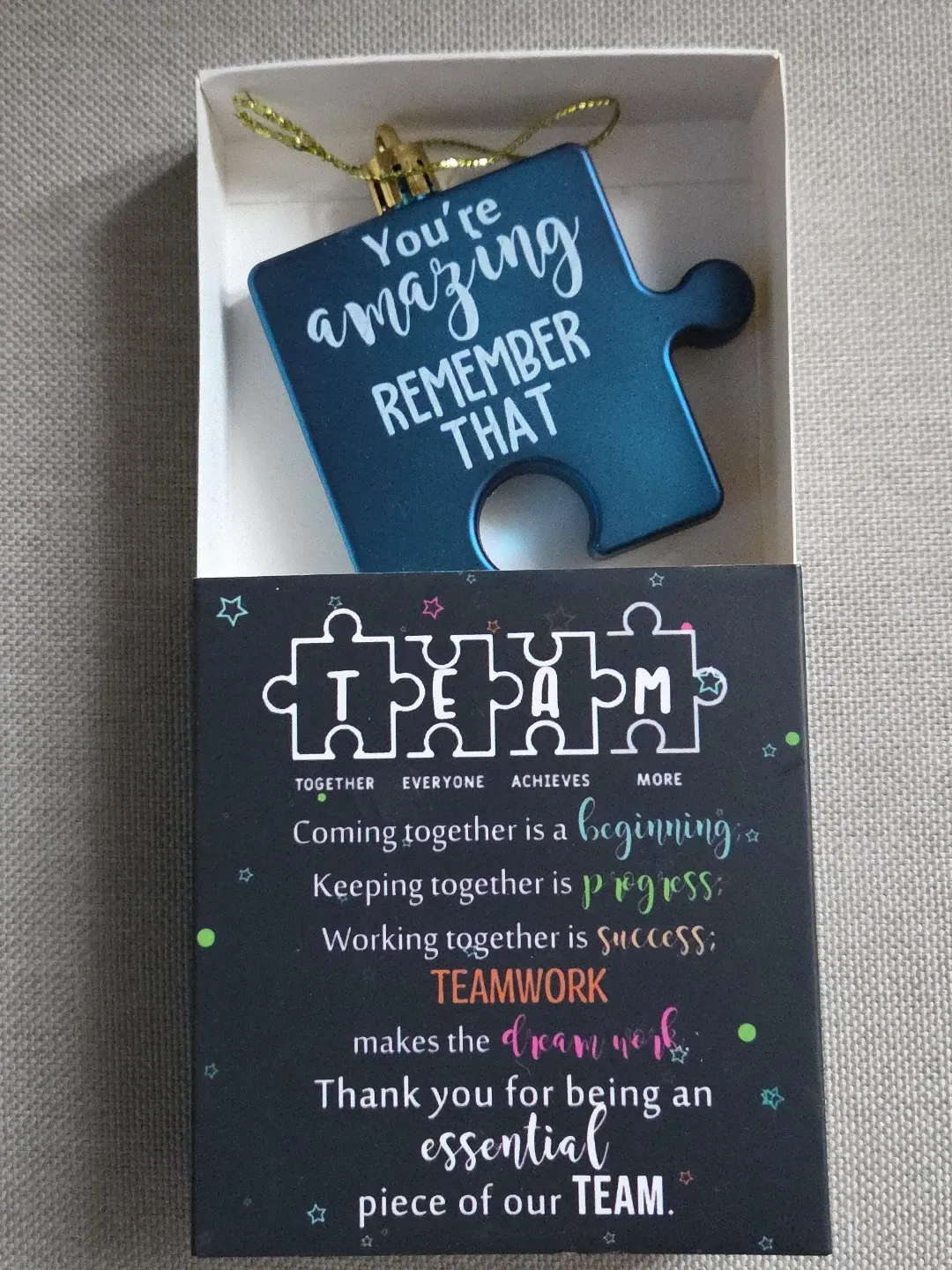A motivational puzzle piece ornament with the message "You're amazing, remember that". It comes in a box with a "TEAMWORK" theme. This item is great for recognizing a team member's contributions.