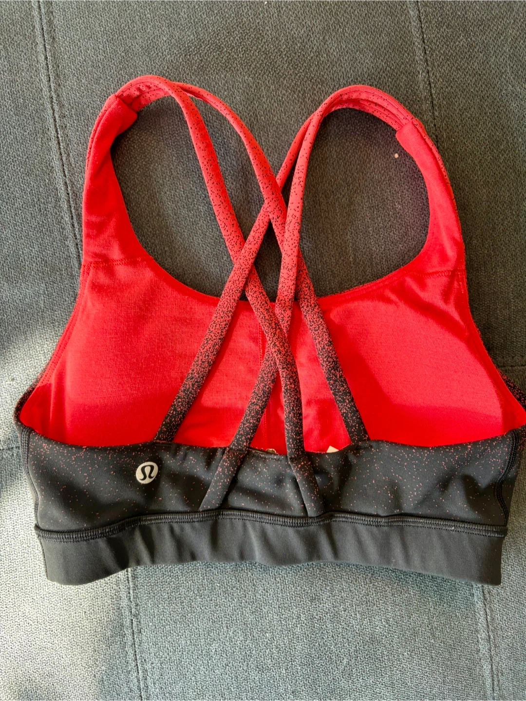 Like new women’s Lululemon sports bra in size small. Black with red at the top and inside. Has padding inside. Pick up new sherboune and Adelaide st east or sometimes at some TTC stations.