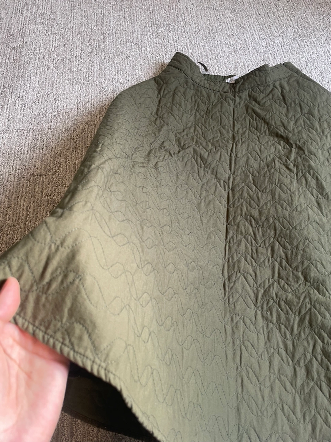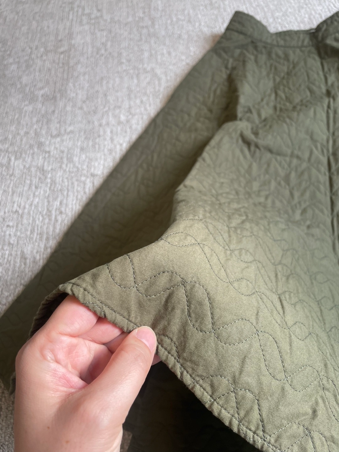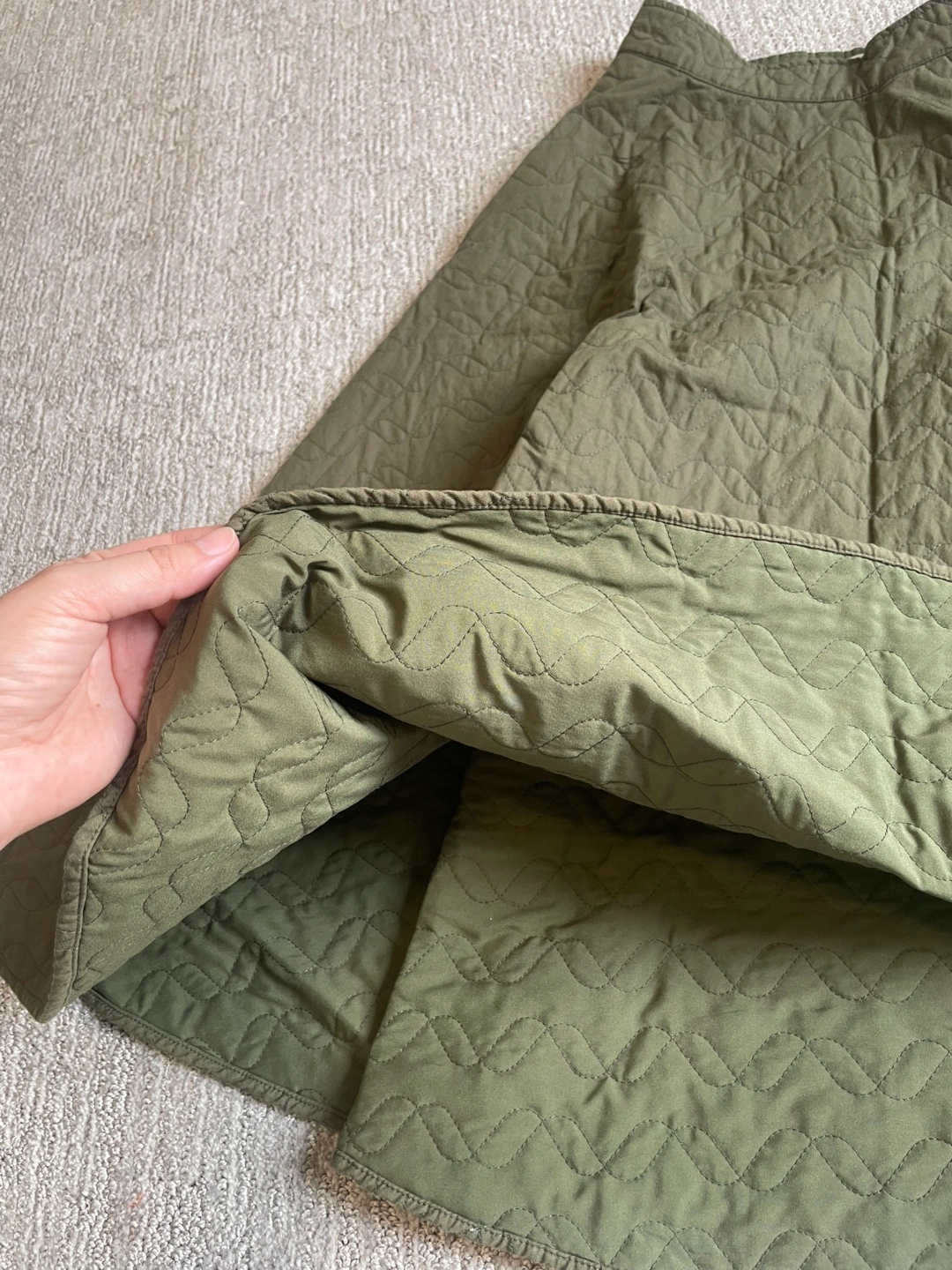 Quilted A-line midi skirt by Uniqlo JW Anderson. Features a soft olive green colour and wavy stitch pattern. Made in China with 100% cotton face and 100% polyester filling and back. Waist 70cm, hip 97cm.